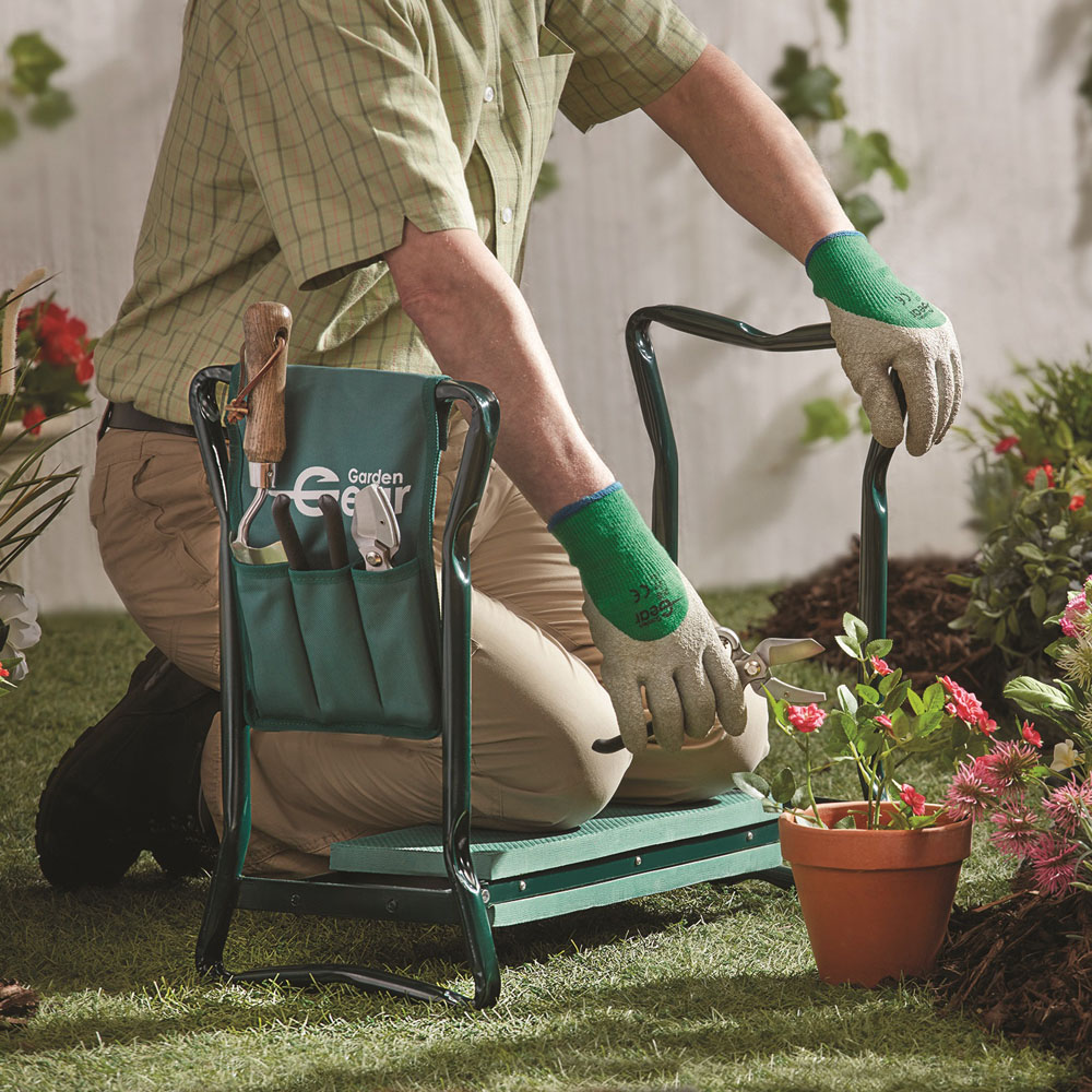 Take the pain and strain out of gardening with this 2-in-1 folding garden kneeler and seat by Garden Gear. The kneeler is great to use whilst weeding, tending to your flowerbeds or tidying up lawn edges. After working hard simply flip the kneeler over and it becomes a comfortable seat in which you can either relax or continue to garden at a comfortable working height. This kneeler and seat comes complete with a handy Velcro pouch that can be used in both the sitting and kneeling position. It features three pockets and is great for keeping garden tools organised whilst working. The durable kneeler and seat are constructed from high-quality steel frames and has a deep layer of polypropylene foam to ensure full comfort whilst in use. To allow for easy storage and transport the versatile kneeler and seat will fold down in seconds. Simply push in the spring mechanism and the legs will fold down to just 12cm high quickly and easily. The multi-functional kneeler and seat weighs just 2.7kg making it easy to carry from place to place. This versatile kneeler is the perfect garden gadget and will put an end to damp, sore, grass stained knees and ensure maximum comfort whilst gardening. It can also be used inside to assist with DIY jobs, cleaning or just as compact, foldable extra seating.