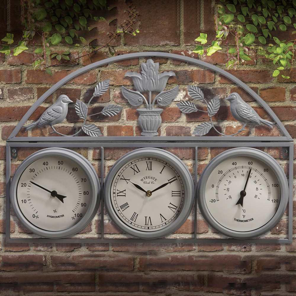 Watch time pass with this elegant 3-in-1 Weather Station. It features an attractive floral and bird design and makes a handy addition to any garden or conservatory. It has an integrated clock, thermometer for measuring Celsius and Fahrenheit and hygrometer to accurately measure humidity. Simply mount to your preferred wall or fence using the sturdy built in mounts (screws not supplied) and watch time pass while you are enjoying long lazy days in the garden. Constructed from powered coated steel for durability, this clock is available in black, grey or cream.