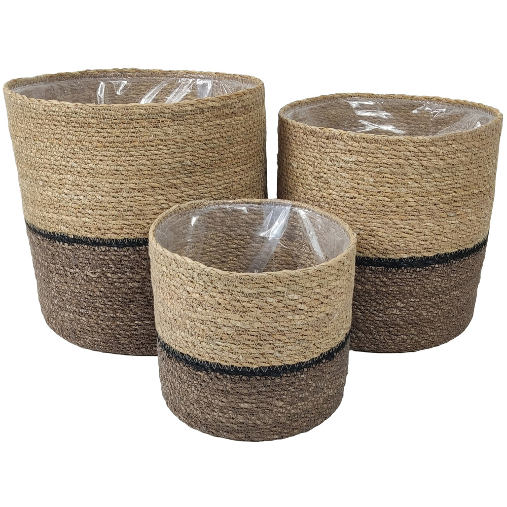 These Natural Navy Seagrass Planter Baskets effortlessly blend natural materials, modern design, and functionality. Expertly handwoven from seagrass fibres, the planters are both durable and lightweight, featuring a minimalist, rustic aesthetic that's perfectly in tune with current trends. Each planter is lined with a plastic coating, allowing you to conceal plastic pots or trays while creating a stylish, earthy display for your plants. Please note that due to their handcrafted nature and use of natural materials, slight variations in size may occur. The set includes three planters in the following sizes: Large: Diameter 25 cm, Height 25 cm Medium: Diameter 22 cm, Height 22 cm Small: Diameter 17 cm, Height 16 cm.