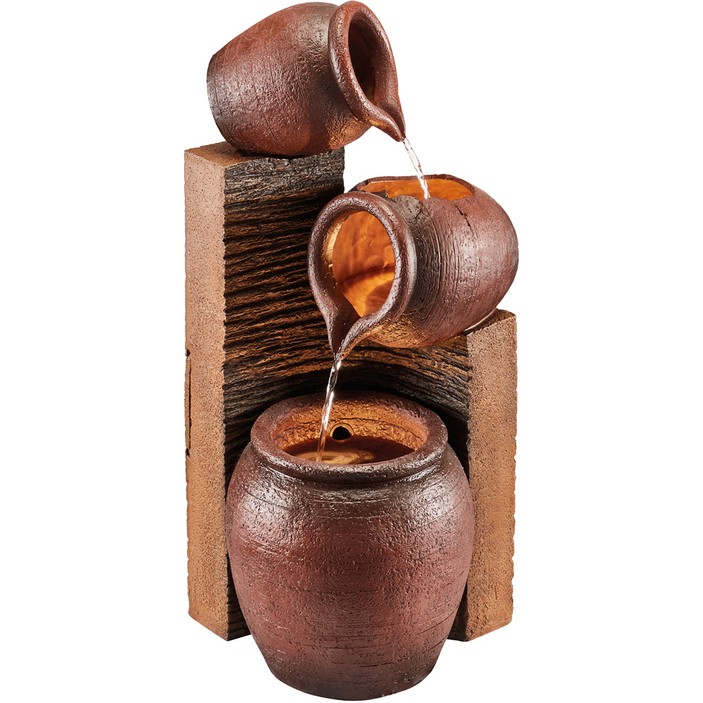 Create a beautiful focal point in your garden or courtyard with this tipping pots water feature from Serenity. Features three aged pots staggered on walls, gently pouring water into the next whilst being lit up by built-in LED lights. The water feature is self-contained, making it great for those without a mains water supply through their garden or courtyard. Simply fill the basin with water and the hidden pump will recycle it continually. The pump carries the water up to the top and then it cascades back down into the basin in a continuous cycle. Constructed from a durable yet lightweight polyresin to help prevent frost damage and cracking.