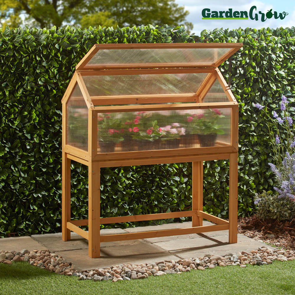 Extend the growing season and keep fragile plants protected from harsh weather conditions with this wooden cold frame from Garden Grow. Cold frames are great for protecting young seedlings, vegetables or flowers from adverse weather, primarily the cold and wet. Simply lift your plants into the cold frame for protection from frost through winter months. The transparent roof allows sunlight to penetrate without the risk of heat escaping. The cold frame is constructed using strong and durable fir wood with polycarbonate panels. It features a hinged lid and raised legs to make accessing your plants hassle free. This raised cold frame will make a great addition to any garden. Specifications Dimensions: L90 x W51 x H104cm Weight: 7.3kg Assembly required.