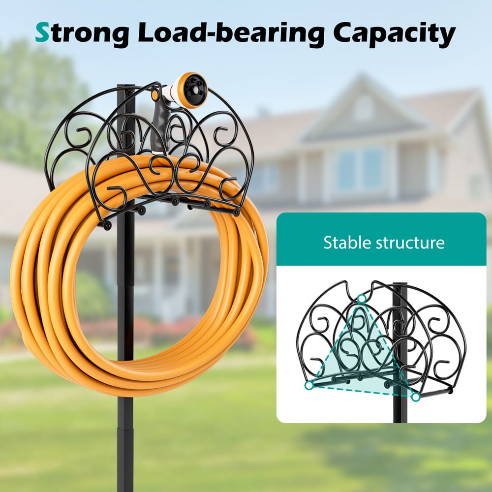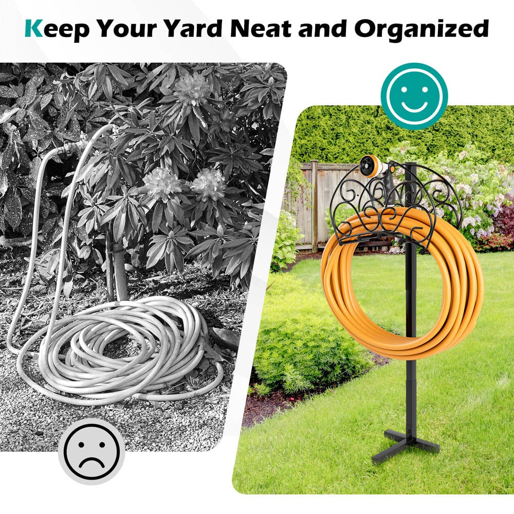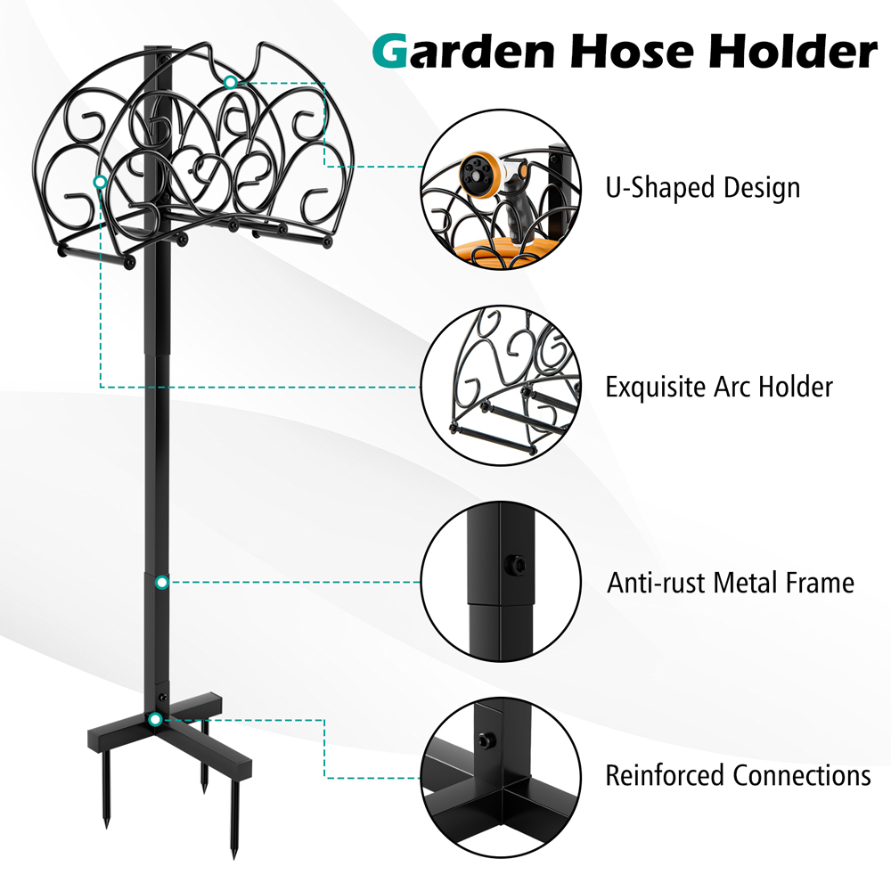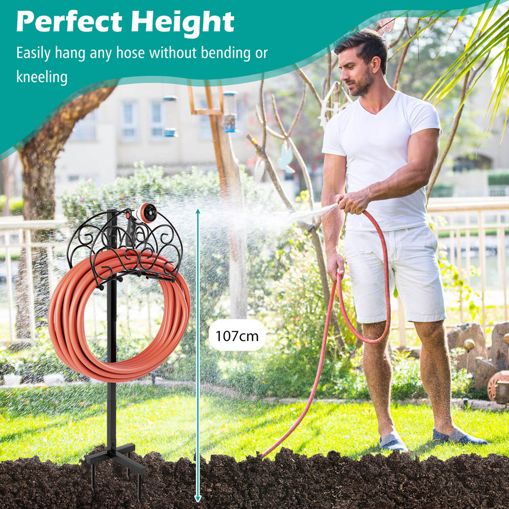 Place your hose easily in your garden with the Costway Garden Hose Holder. This versatile holder can be positioned anywhere in your garden as a freestanding unit or mounted against a wall. With an optimal height of 107 cm and a hose hanging height of 65 cm, it ensures effortless hose management and quick access. The durable arc holder, combined with a sturdy metal tube design, offers exceptional durability and functionality. Additionally, the three sturdy anchor points grip the soil to stabilize the stand. Assembly is a breeze with the step-by-step instructions provided. Enhance your gardening experience with this practical and space-saving garden hose holder.