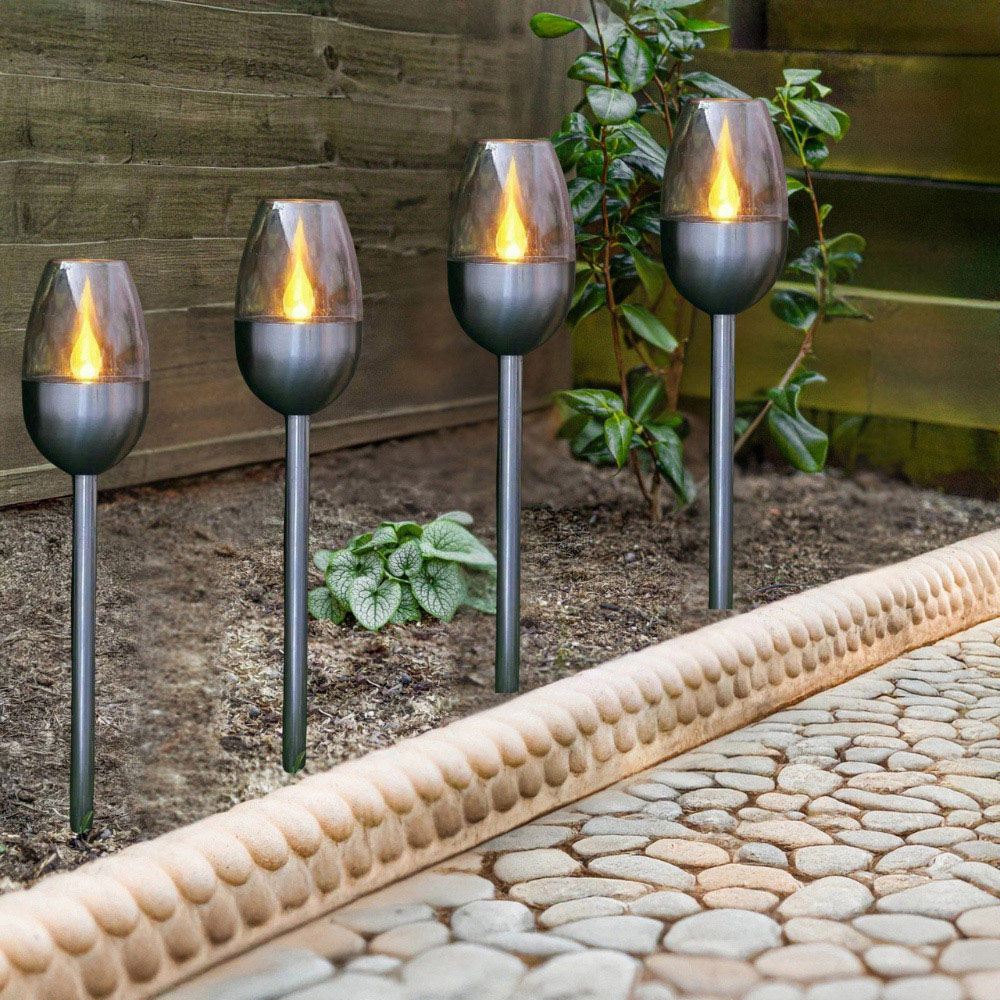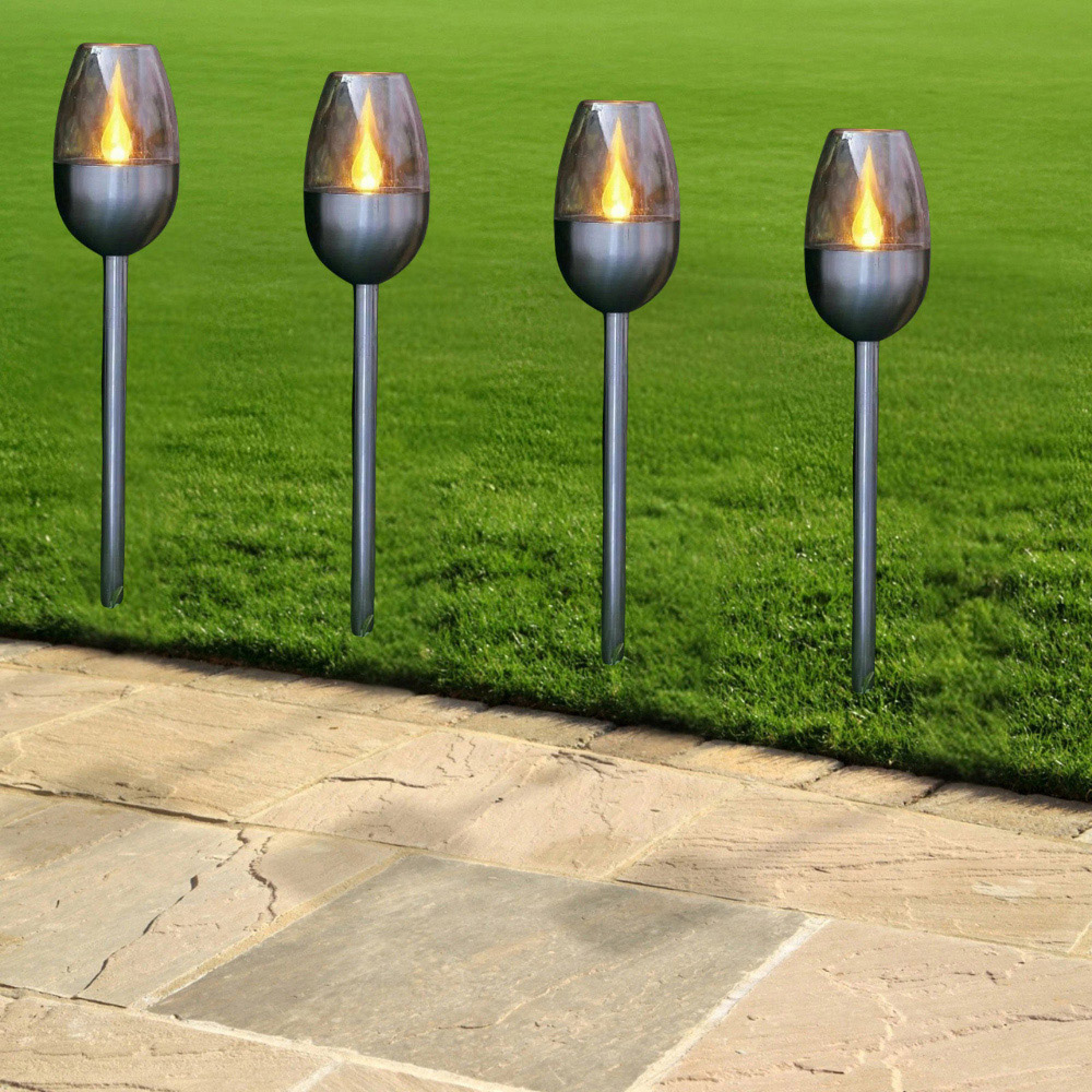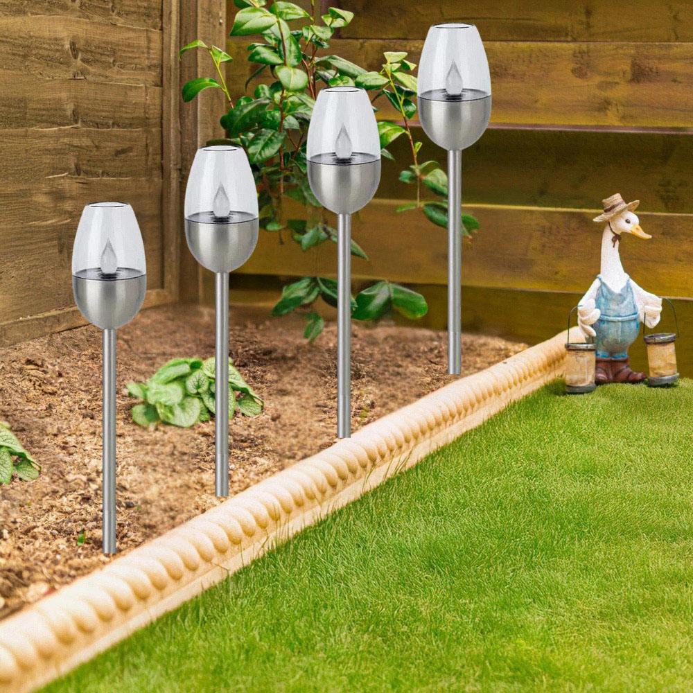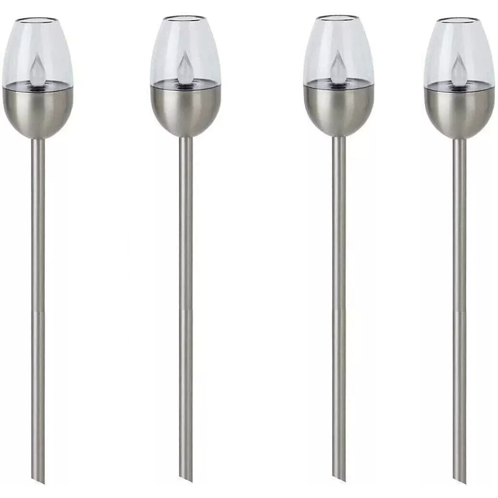 Brighten your garden path with these Solar LED Stake Lights! A great way to save money on your energy bills and to light up your outdoor space. This 4pc Set of lights are completely solar powered, simply place the solar panels in complete sunlight to charge and watch as they will illuminate at night automatically. Please wipe down the solar panel once in a while to avoid rusting. These lights are sure to brighten up any dull area of your garden. Place these lights along your garden path, in flower beds, near decking, or at your front door to brighten up your door for any visitors coming to see you. These can run up to 6 hours on a full days charge. A must have for any outdoor space!