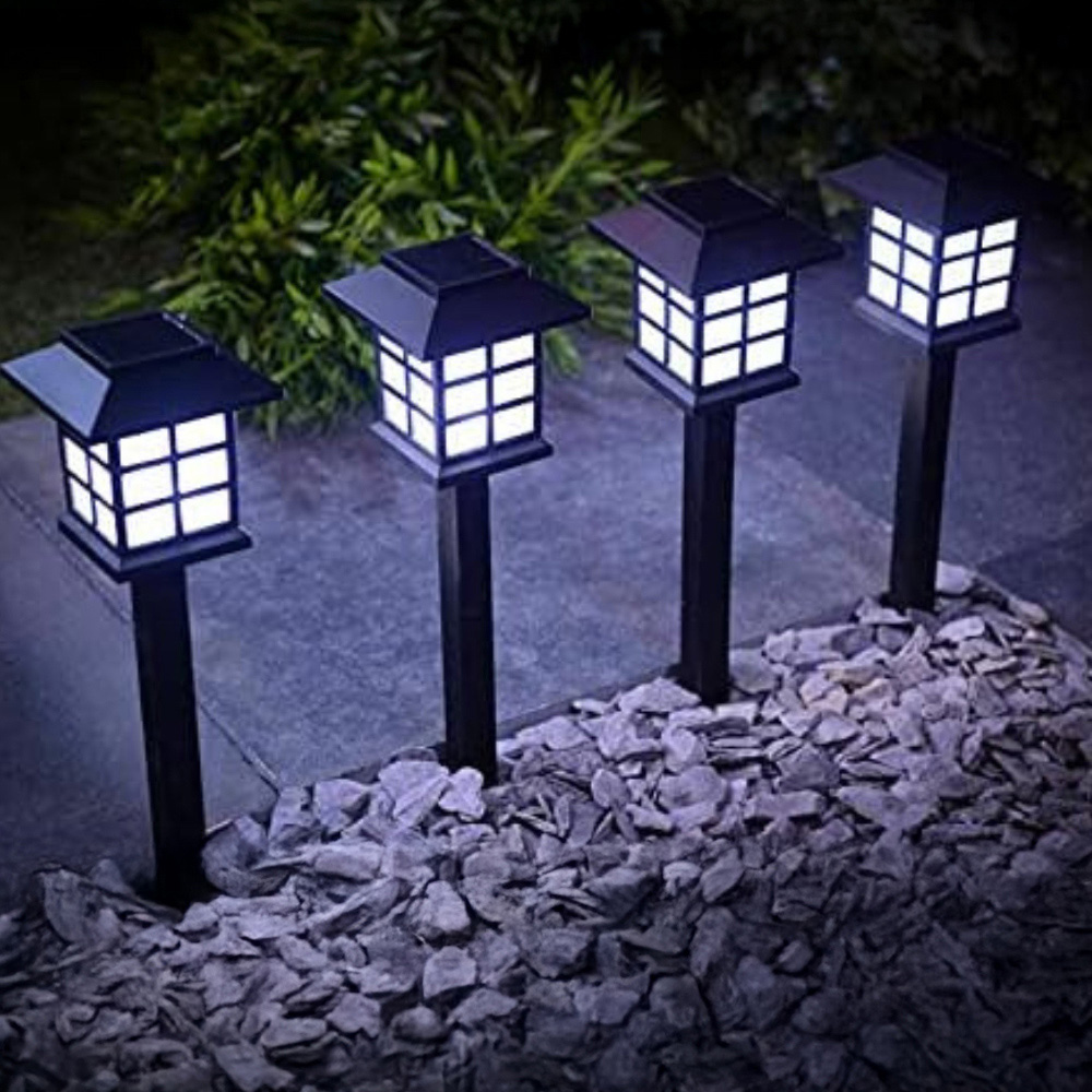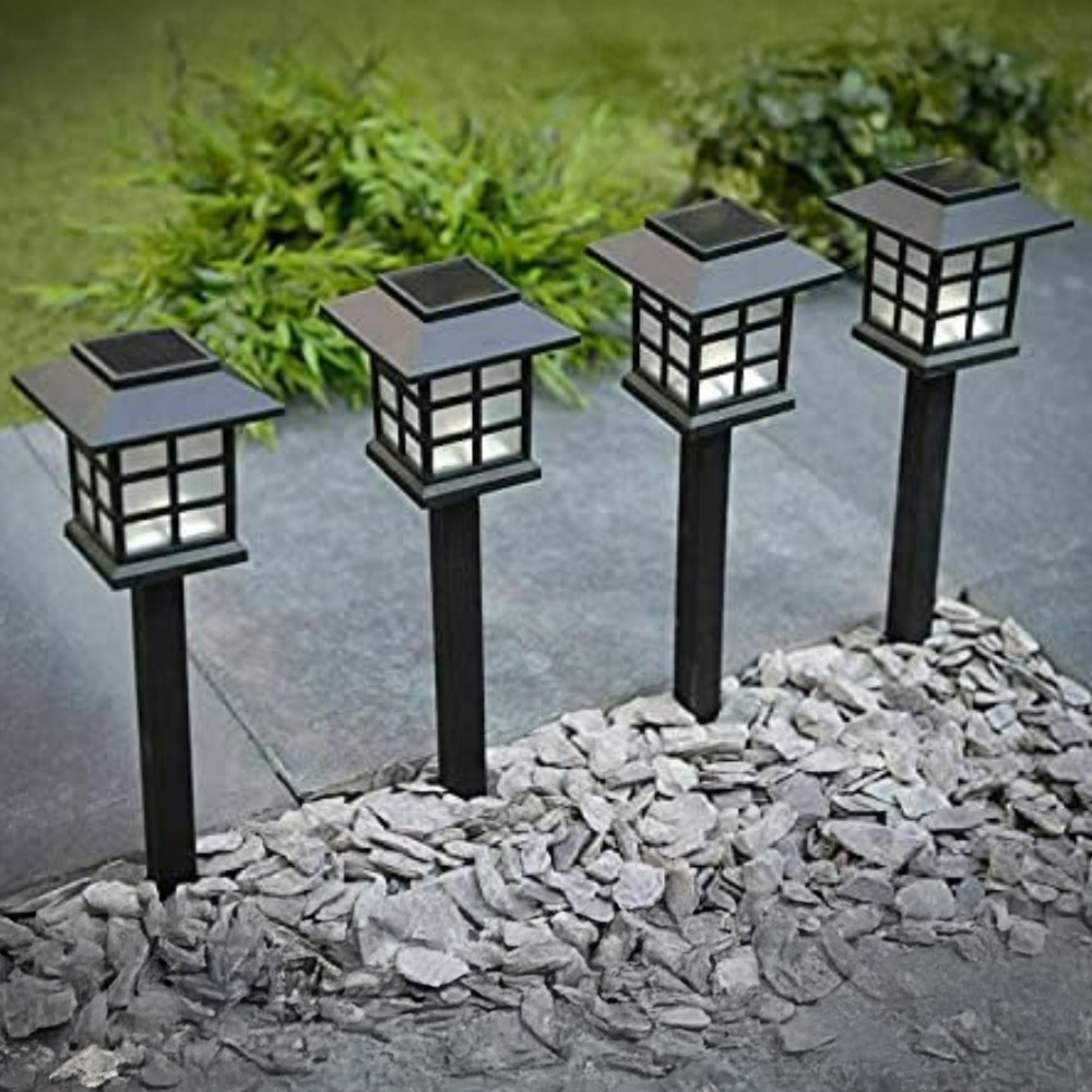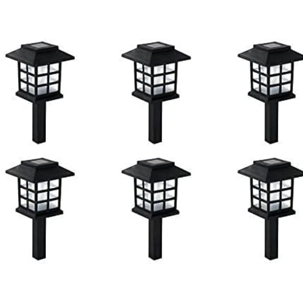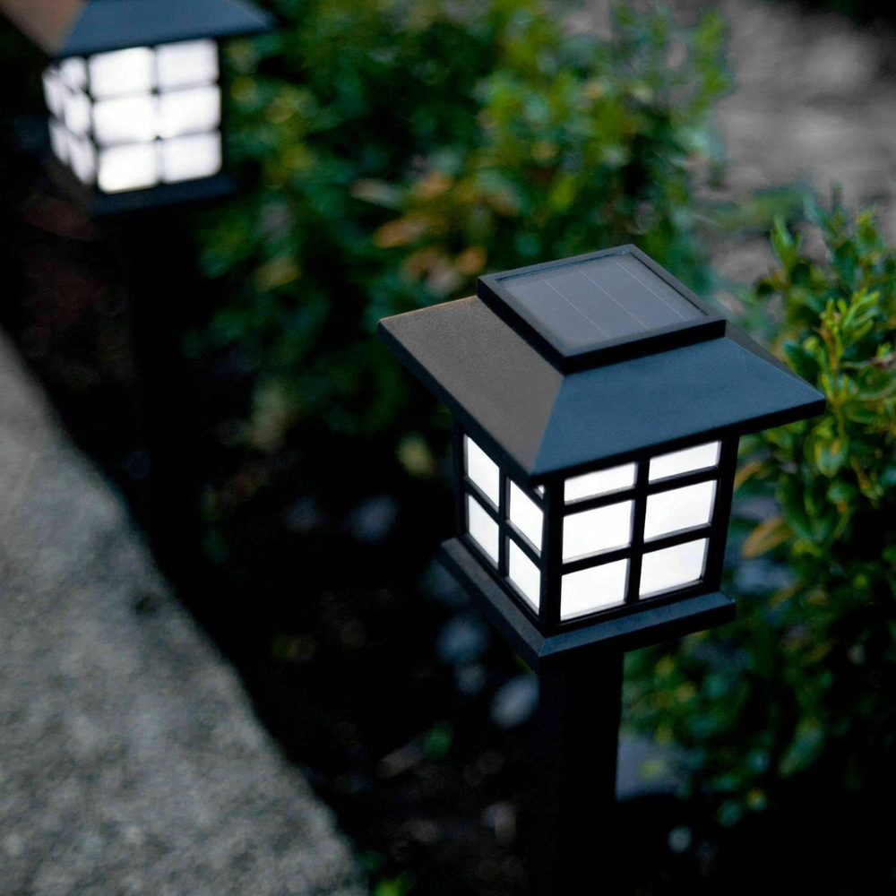 Bring a touch of oriental charm and style into your outdoor space with this set of 6 striking black solar powered LED lanterns. Each lantern houses one white LED bulb which emits an impressive glow. You can count on 8 hours illumination each night in spring and summer. Supplied with ground spikes, these solar lights are really easy to insert into your soil or grass. There is also a handy OFF switch for when you don't want the lights to illuminate or when you require more than 1 day's charge in the dull winter months. With a smooth black plastic housing, these solar stake lights are fully weatherproof for use all year round. White LED bulbs give an impressive glow.