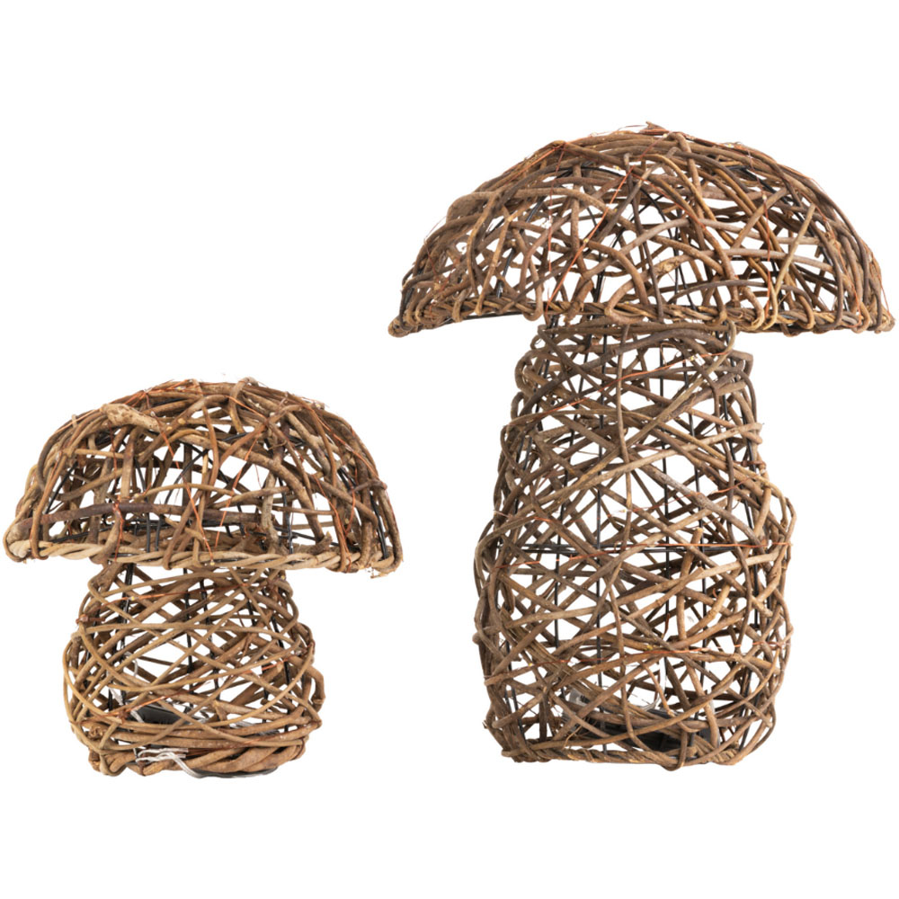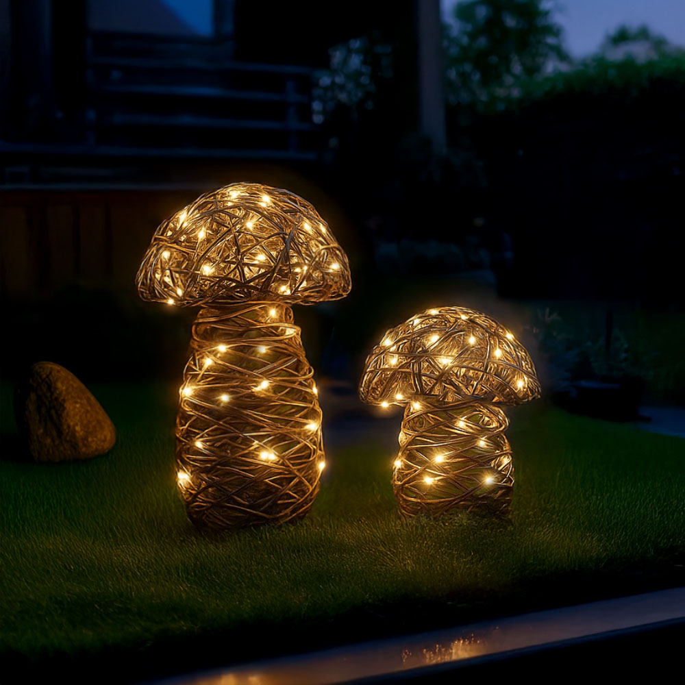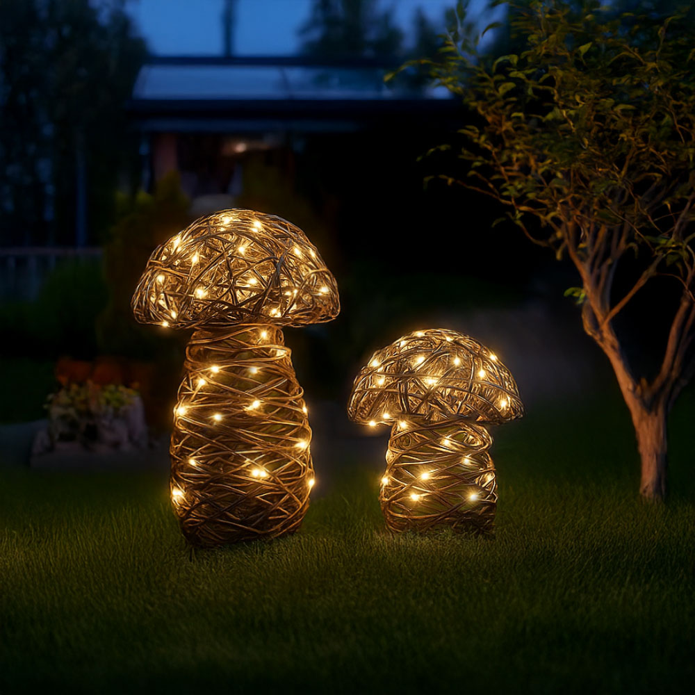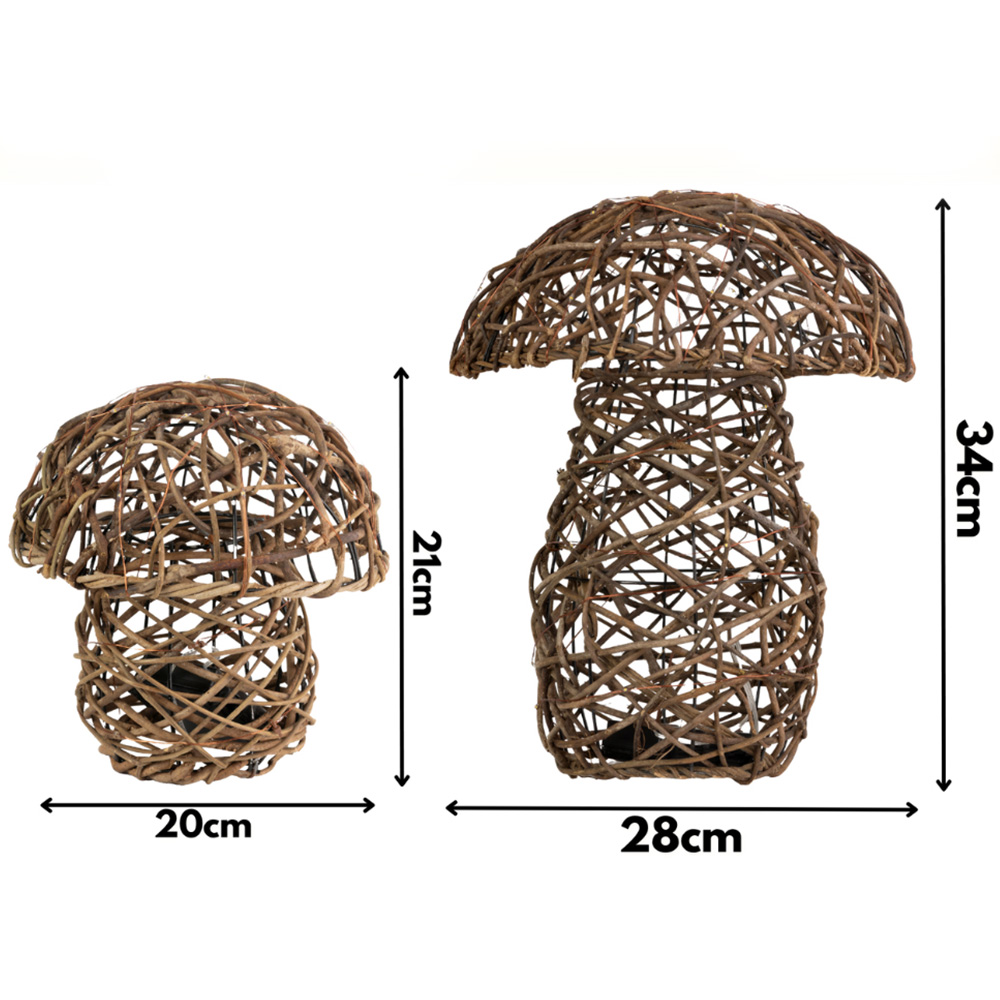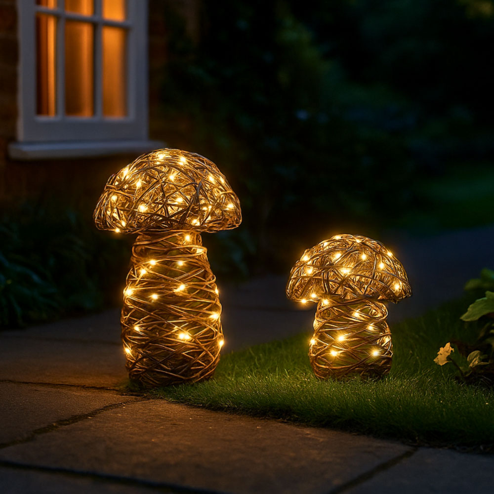 Bring your garden to life with these LED Mushrooms! A great way to bring a dull area to life. Made from hard wearing and durable Rattan, these mushroom lamps are for indoor and outdoor use! Completely battery powered, these lights can be moved with ease without the worry of wires hanging everywhere. With Warm White LED's wrapped round these mushroom lights, they come with a auto timer so there is no need to turn these off before you are settled for the night. These Mushroom lights can be used in your flower beds, beside your front door or any dull area of your outdoor space as well as in your home at the foot of the stairs, as a table centrepiece or next to your side board. This mushroom is a versatile decoration you want in your home or garden. A must have for the Autumn Season.