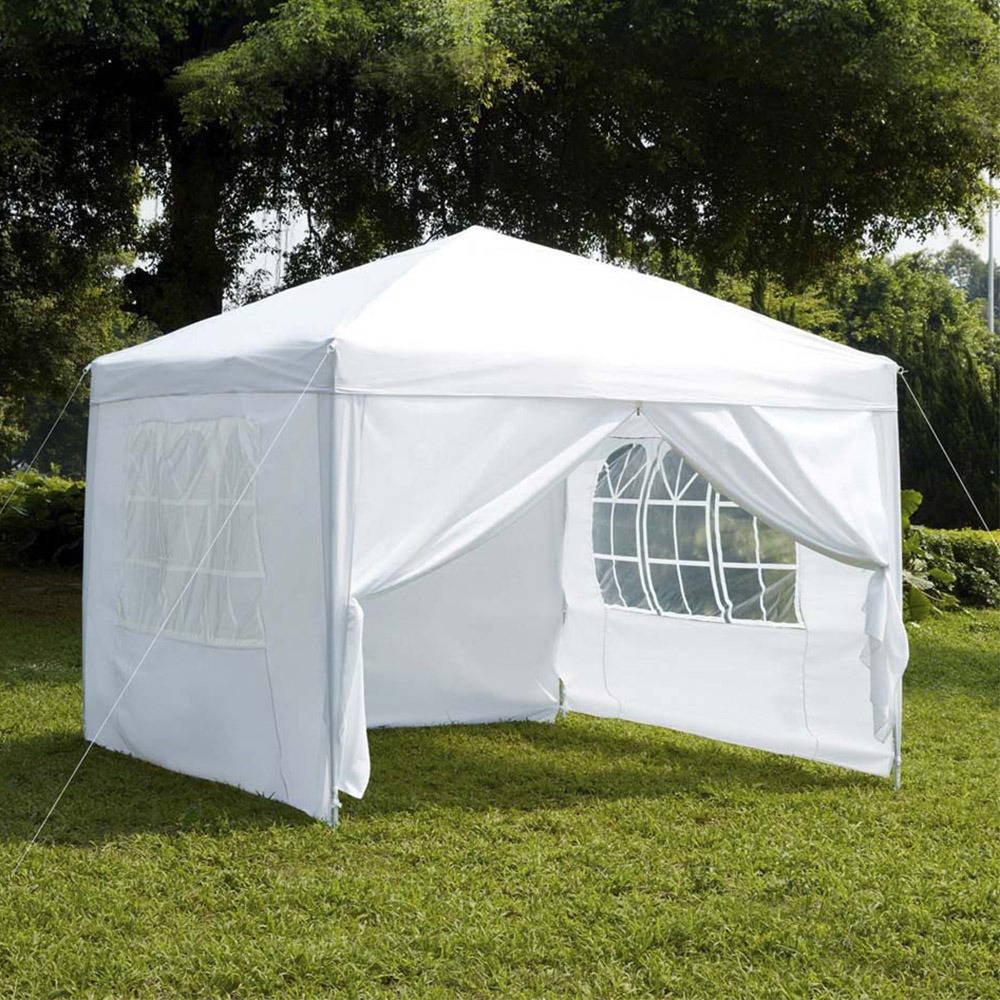 Introducing the ultimate solution for instant outdoor shelter – this White Pop Up Gazebo from Garden Vida! measuring 2.5 x 2.5m, it is designed with sides to elevate your outdoor experience to new heights. Whether you're hosting an event, enjoying a picnic, or seeking shade on a sunny day, this gazebo offers convenience, versatility, and protection in one impressive package. Crafted with precision, the water-resistant canopy ensures that you remain comfortably sheltered from both the sun's rays and unexpected rain showers. This canopy, coupled with the sturdy steel frame, creates a reliable and robust haven that stands strong against various weather conditions. Designed with convenience in mind, it comes complete with wind bars, sandbags, and cords. These essential accessories enhance stability, anchoring the gazebo securely even in windy conditions. So, whether you're by the beach, in a park, or in your backyard, you can enjoy your outdoor moments with utmost confidence. Setting up your outdoor oasis is a breeze, thanks to the user-friendly design of this pop-up gazebo. When your day is done, the included carry bag makes it effortless to pack and transport your gazebo, ensuring that you're always ready for your next adventure. Material: Steel and Polyethylene. Note: This item requires self-assembly with easy-to-follow instructions provided. The gazebo is made from a waterproof polyethene fabric, which means that the gazebo is showerproof, but it is not recommended as protection against heavy rainfall or extreme weather conditions. The actual colour of the product may vary slightly as your screen display setting and lighting in your home environment may differ.