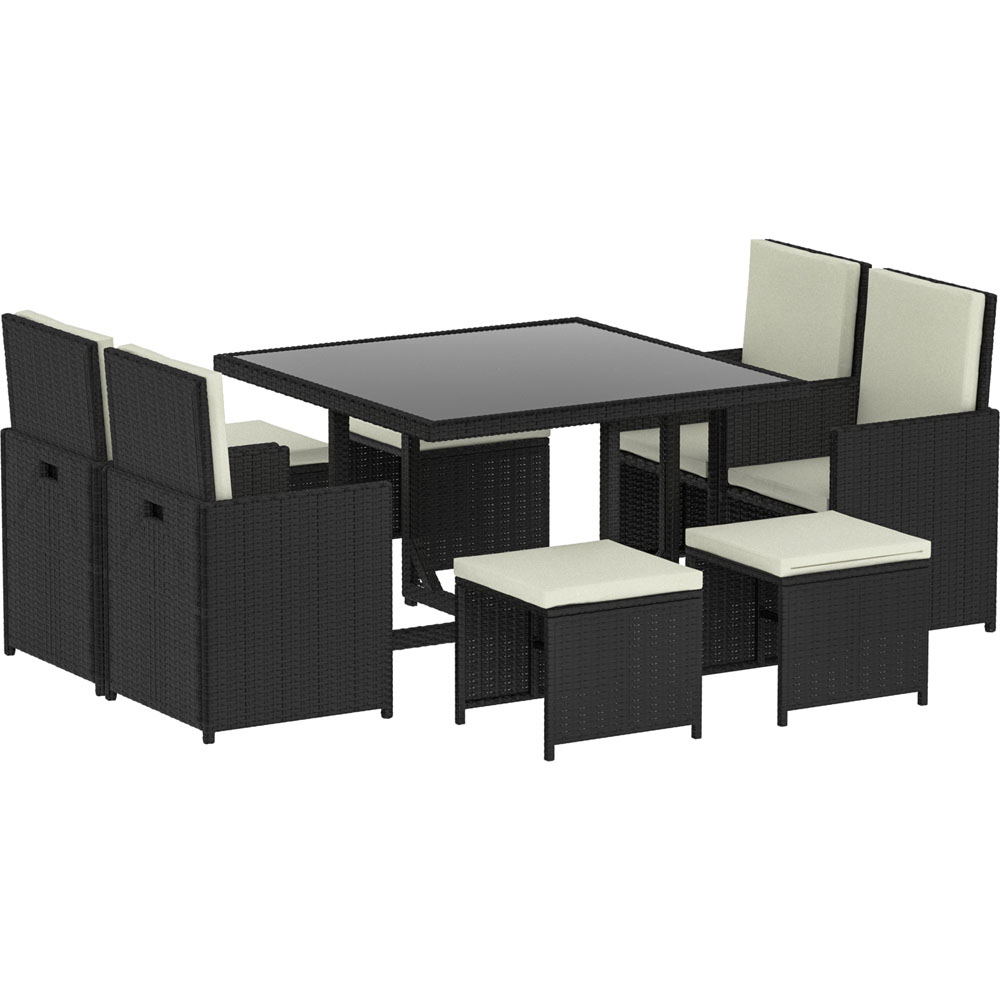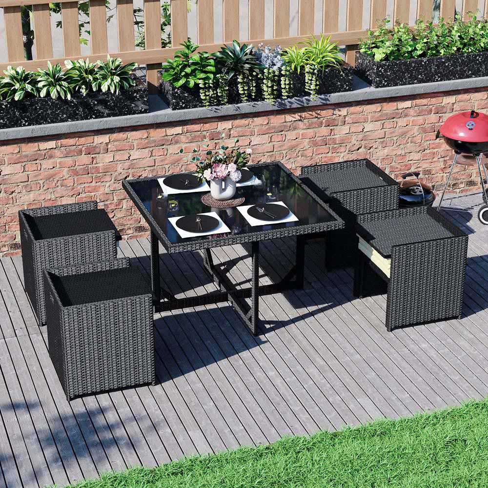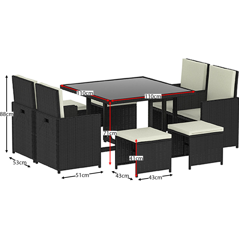 Transform your outdoor space with this beautiful Garden Vida Cuba Black 8-Seater Rattan Set. This collection boasts a stylish and breathable design that is both versatile and elegant, adding a touch of sophistication to your outdoor paradise. With a sleek black finish, it includes a dining table with tempered glass, four chairs, and four stools with comfortable back and seat cushions. Designed to be safe, the set is fire-retardant and UV-resistant, ensuring complete safety from the elements. Easy to maintain, the cushion can be easily washed to remove stains and spills. Ideal for most outdoor settings. Protect your garden furniture with our durable and waterproof covers. Explore our wide range of heavy-duty Garden Furniture covers to find the perfect fit for your needs.