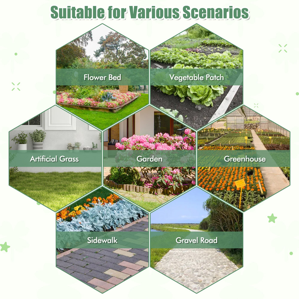 Wave goodbye to pesky weeds with a smile using the Costway Garden Weed Barrier Fabric, measuring 3.5Oz 1 x 50m. Made from durable fabric with smooth edges, this barrier is built to last and easy to cut. It effectively blocks sunlight while keeping soil moisture intact, creating an ideal space for your plants to thrive. With its breathable and permeable design, it ensures that air and water circulate properly for healthy plants. Whether you're tending to a flower bed, vegetable garden, artificial turf, greenhouse, sidewalk, or gravel path, this versatile and dependable weed barrier fabric is your perfect solution. Just cut it to the size you need, plant your greenery, and secure the barrier, it's that simple.