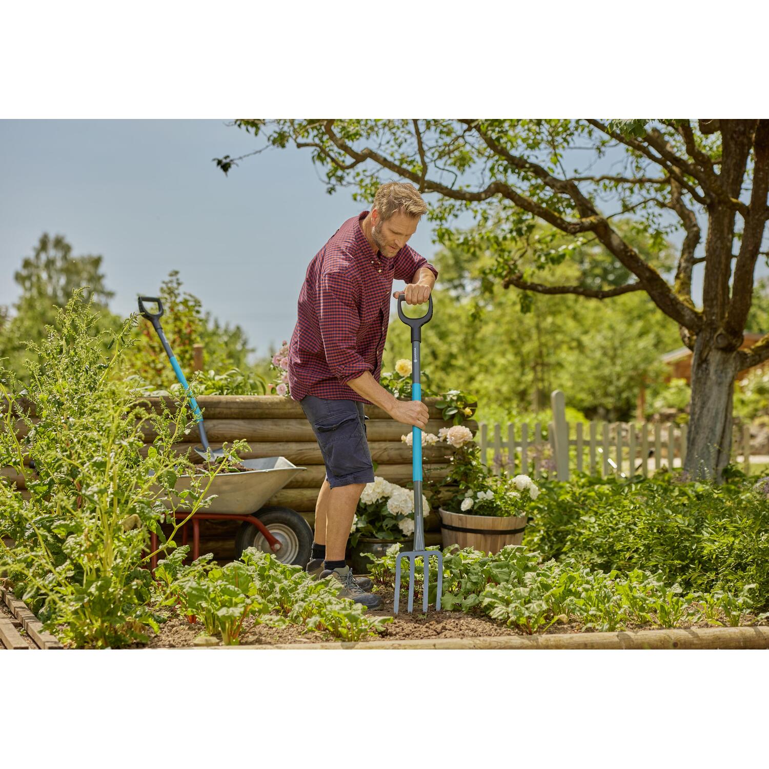 Work comfortably in your garden with less bending down and strain on your back using this Classic Line Fork, featuring a long, solid metal shaft for durability and comfort. It's paired with an ergonomically designed D-shaped handle for easy and comfortable use, no matter how demanding the task. The fork also features an extra wide footrest at the top to prevent your foot from slipping while giving you power and leverage. It also features high-quality, wide metal tines with sharp ends to help loosen soil and ground with less physical effort.