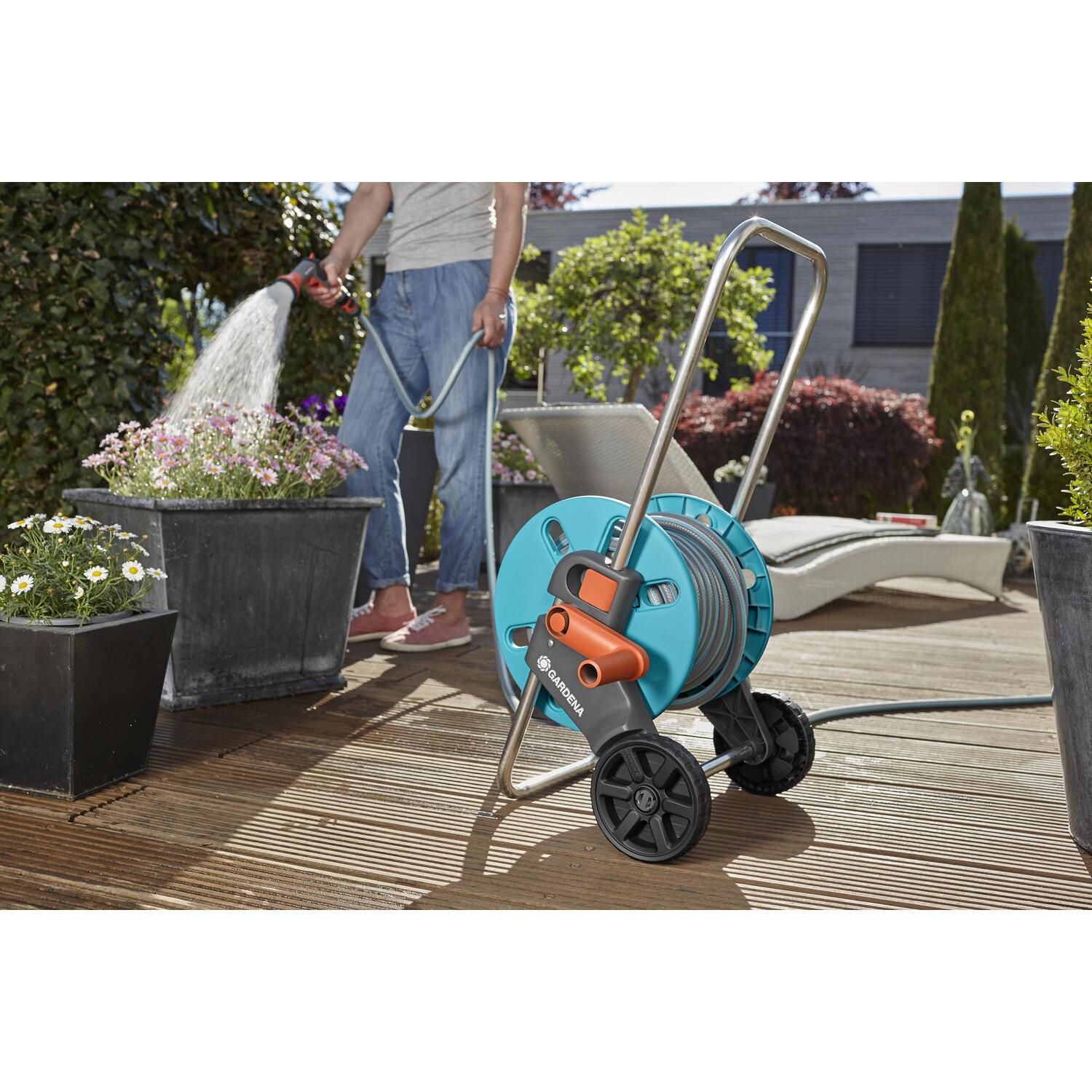 The Clever Roll Hose Garden Trolley with convenient handling provides space-saving storage of the garden hose. Complete with a 20m hose, so everything in this set interconnects from start to finish and stays watertight. The angled hose connection on the inside of the reel prevents the hose from bending, consistently guaranteeing maximum water flow. With an anti-drip device to prevent water from leaking out after use or while transporting the hose trolley, the handle can be lowered for space-saving storage of the hose trolley in the garage or garden shed.