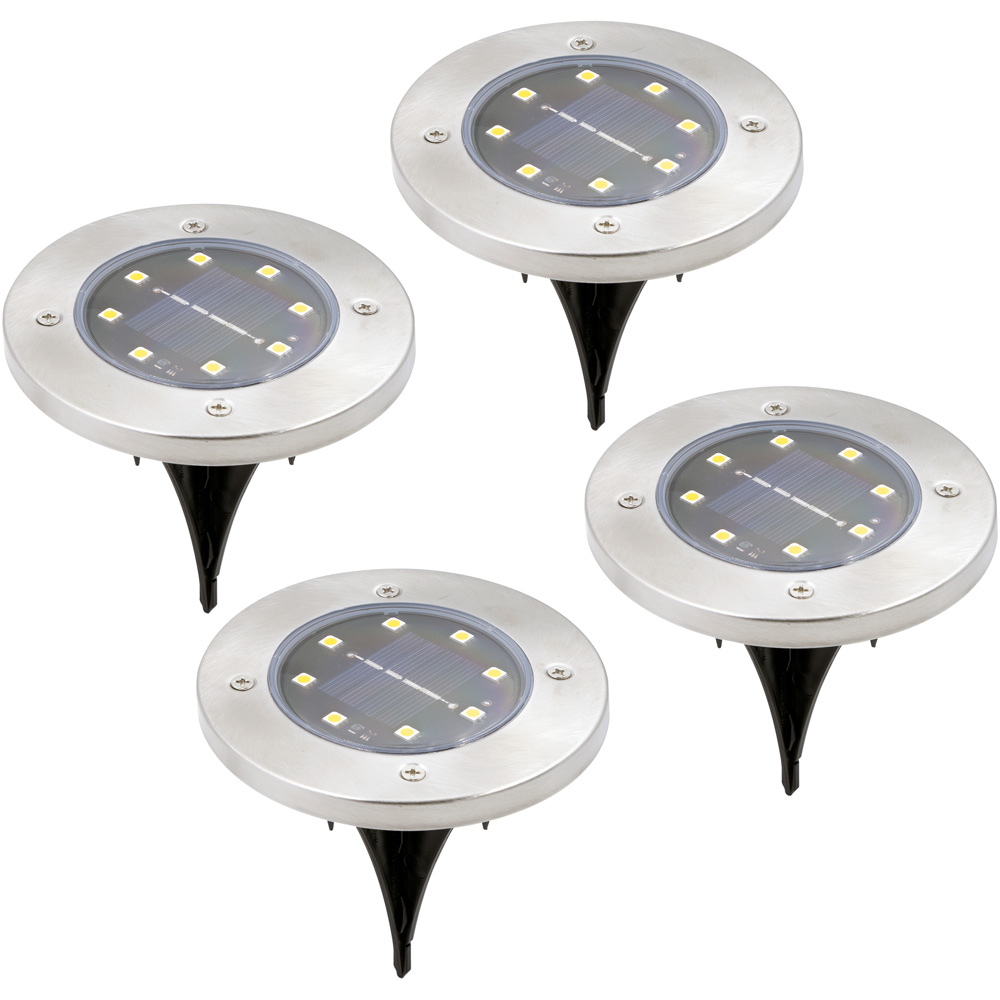 Give your garden an attractive glow with these compact Ground Lights from GardenKraft! Shining in a bright white colour, they're great for decorating along lawns, patios, pathways, and more. All of the lights are solar powered, collecting light during the day in order to illuminate your garden at night. This saves the need for any wiring or cables. The lights power on automatically at night, and will last for up to eight hours on a single charge. The lights are made from strong and durable materials - a mix of stainless steel around the outside, and plastic over the solar panel. This makes them waterproof, being IP67 certified, so you can leave them outside to glow at all times of the year. Pack size: 4.