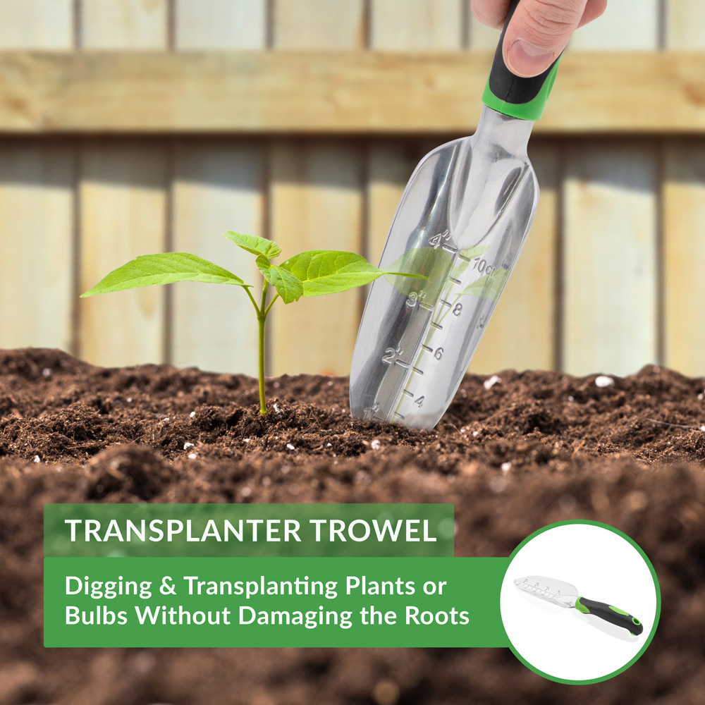 Make gardening easy with this GardenKraft 5-Piece Aluminium Garden Tool Set. This set includes a planting trowel, a transplanter trowel, a handheld rake, a handheld fork, and a weed cutter. Made using heavy-duty die-cast aluminium, these tools will last a long time. Comfortable to use, the tools have non-slip rubber handles for a perfect grip even while wearing gloves. The handles also come with a small hole at the end, designed to hang the tools - ideal for storage on shed racks. Each tool measures around 30cm long with widths between four to eight centimetres and weighs less than 210g individually for easy use and store.