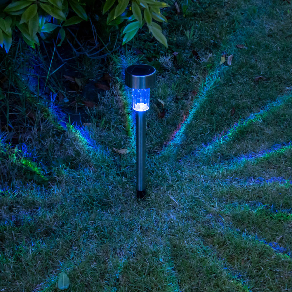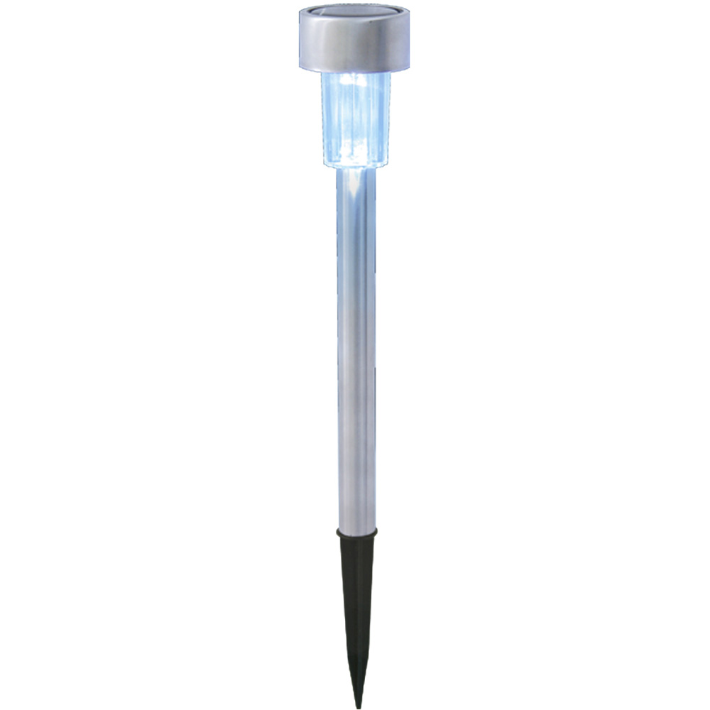 These bollard-style Stake Lights from GardenKraft ooze class and provide a real sense of sophistication to any outdoor space. They insert easily into soft surfaces such as soil and turf, allowing you a full range of installation ideas. The lights are solar powered meaning that they don't require any effort on your behalf to get them glowing at night. Complete with an auto-on system, the solar panels on top of each unit store energy from the sunshine of the day, and as soon as dusk sets in they convert that energy to light through the 3.5 lumen LED light. These stainless steel garden lights are fully weatherproof allowing them to be left outside all year round without risk of compromising the quality of the product. Pack size: 10.