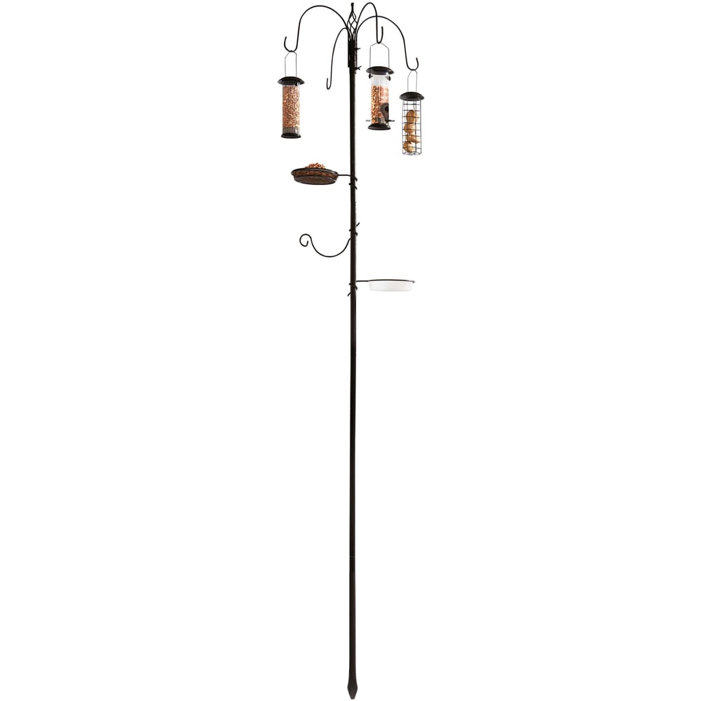 Introducing the Gardenkraft Metal Bird Feeding Station, a perfect addition to your garden to attract a variety of beautiful wild birds. This feeding station is equipped with five feeder hooks and enough space for two trays, ensuring there is plenty of food for multiple birds. The pole structure is constructed from four segments of powder-coated steel, which can be easily assembled by screwing them together. The metal head is then screwed on top, resulting in a total height of 240cm. Along with the feeding station, you will receive all the essentials you need, including two PVC bird feeders, one metal mesh bird feeder, one suet ball feeder, one metal wire tray, and one plastic water dish. With its metal construction and easy setup, this bird feeding station is a must-have for bird enthusiasts.