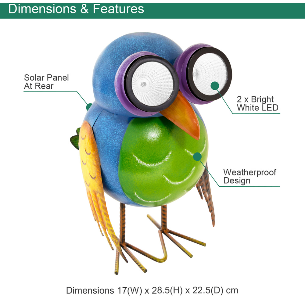Make your garden more attractive with the GardenKraft Metal Owl LED Solar Light. This eye-catching and colourful light-up owl statue makes a wonderful decorative feature for your garden decking, patio or flower bed. It features two bright white LED lights placed in its eyes that add to the beauty of the garden area. This garden light is solar-powered, which ensures no extra running costs are required. This statue houses an automatic sensor that detects whenever the sun sets and automatically illuminates the light. It is manufactured from weatherproof metal that makes it suitable to be placed outside all year round. You can rest assured about the performance of this light-up statue as it will not succumb to the elements.
