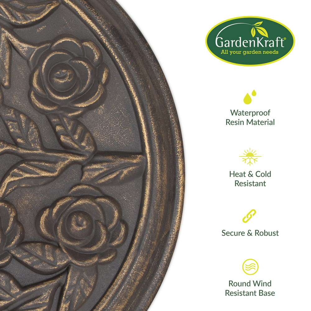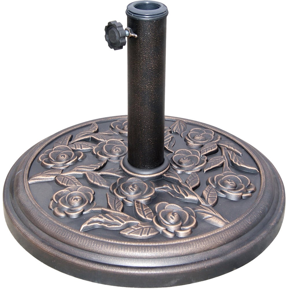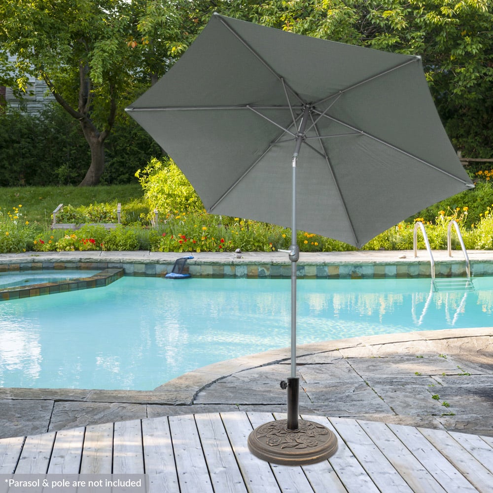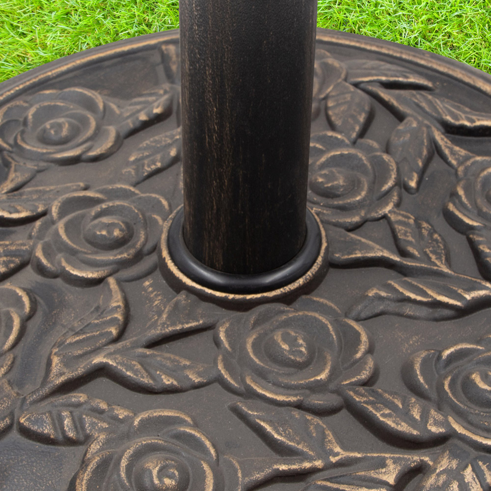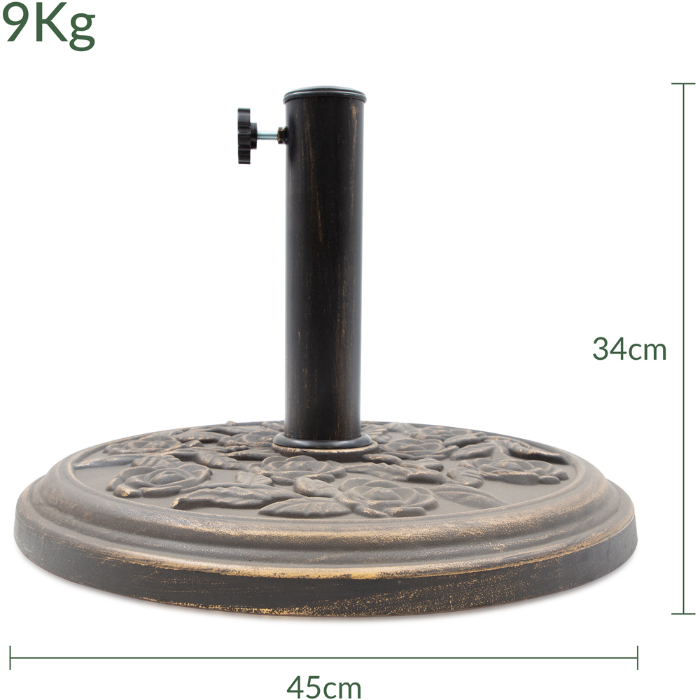 Keep your parasol stable with this GardenKraft Rose Resin Parasol Base. With this base, you can transform any area of your garden to be a shaded retreat with your choice of parasol. Its simple yet elegant design will allow you to place with any outdoor furniture without it looking out of place. Simply slot in your parasol to the top of the stand and tighten the adjustable screw to ensure it stays upright and secure. Also, as you adjust the screw it will fit any parasol up to a diameter of 48mm. The overall base measures at 45cm in diameter and 34cm in height. Weight: 9kg.