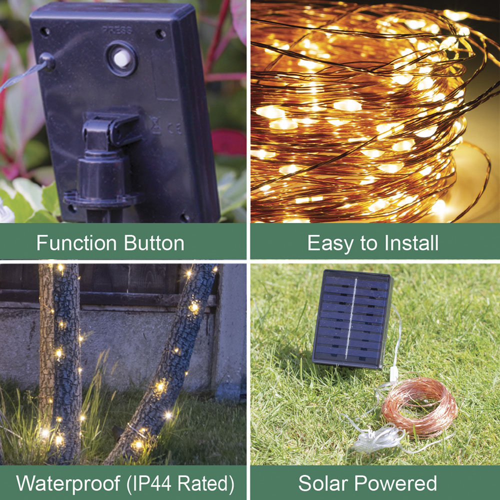 Add a touch of elegance to your outdoor space with the GardenKraft Warm White 200 Micro Copper Solar LED String Light. These stunning solar-powered lights are perfect for illuminating your garden, patio, fence, or any outdoor space. This string light features sequential, combination, chase flashing, twinkle flashing, waves, slow glow, slow fade and steady-on functions to create a magical ambience. The function button at the back of the panel allows you to set the required functions. The solar panel comes with a stake for easy installation in your garden. Total LEDs: 200 warm white. Wire length from panel to the first bulb: 2m. Length: 19.9m.
