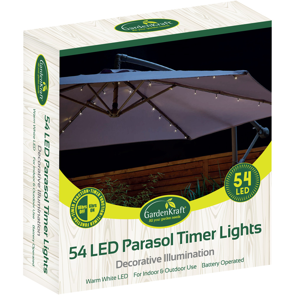 Introducing the Gardenkraft Warm White Parasol Timer Lights, a perfect addition to enhance the charm of your summer evenings. This set of lights features six separate branches, collectively holding 54 LED lights, ensuring a brilliant illumination for any outdoor space. With the convenience of a timer function, these LED garden lights can be set to stay on for six hours and automatically switch off for 18 hours. Additionally, they also offer a chaser function for added versatility. The lights are battery operated, requiring 3 x AA batteries (not included), eliminating the need for trailing wires and allowing you to place them anywhere without worrying about being near a socket. Each branch measures 1.4m in length, providing easy installation and flexibility. Elevate your outdoor ambience with these exquisite warm white LED lights.