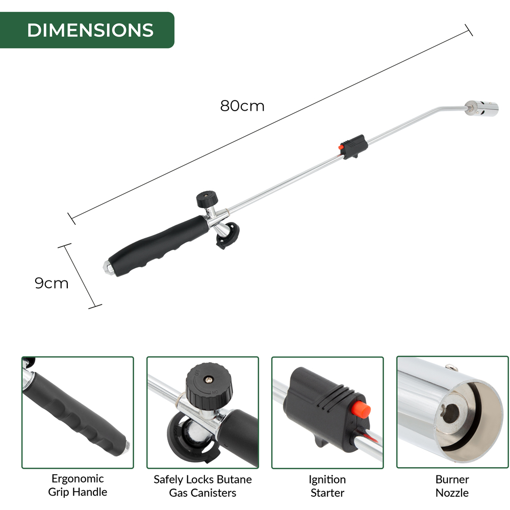 Introducing the Gardenkraft Butane Gas Weed Burner, a convenient solution for effortlessly eliminating unsightly weeds from your garden or patio. This innovative tool harnesses the power of heat to effectively destroy the structure of weeds, ensuring they won't resurface anytime soon. Unlike traditional weed killers that contain harmful chemicals, the Weed Burner utilizes butane gas canisters to generate heat, making it a safer and more environmentally friendly option. With a length of 80cm, this weed burner allows for safe operation without the risk of getting too close to the flame. Additionally, its ergonomic grip ensures comfortable and easy use. Say goodbye to weeds in an easy and eco-friendly way with the GardenKraft Weed Burner. This versatile tool can be used for weeding, lighting bonfires, fireplaces and BBQ Grills, De-icing pavements and unfreezing water pipes.