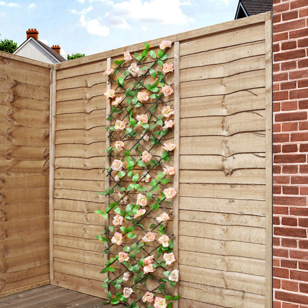 Elevate your outdoor space with the Gardenwize Pink Flower Expandable Garden Trellis with Solar LED. This trellis features artificial leaves and flowers woven onto a wood-effect frame, giving it an organic look and feel. It comes with a set of 100 LED string lights that are 100% solar-powered. During the day, the solar panel absorbs sunlight to recharge the battery unit, and at night, the lights automatically turn on, transforming your trellis into a charming and dazzling display. Simply attach it to fences or walls to create a beautiful and enchanting atmosphere in your garden.