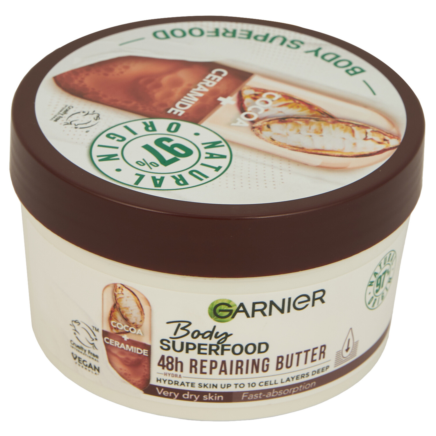 Treat your skin to a luxurious experience with Garnier Body Superfood Cocoa Repairing Butter 300ml, which deeply nourishes and moisturises your skin for up to 48 hours. Its fast-absorbing formula enriched with cocoa butter and ceramides leaves your skin instantly softer and more supple. Ideal for use on very dry skin, it's vegan and made with 97% natural ingredients and water.