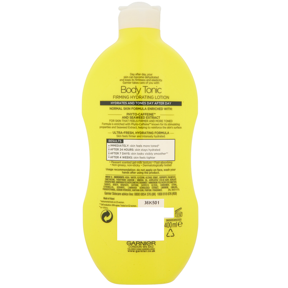 Treat your skin to a luxurious experience with Garnier Body Tonic Phyto-Caffeine and Seaweed Extract Firming Hydrating Lotion 400ml. This rich lotion not only deeply hydrates but also leaves your skin feeling incredibly soft and revitalised. Enriched with phyto-caffeine and seaweed extract, it bolsters your skin's natural protective barrier, locking in moisture for a prolonged period.