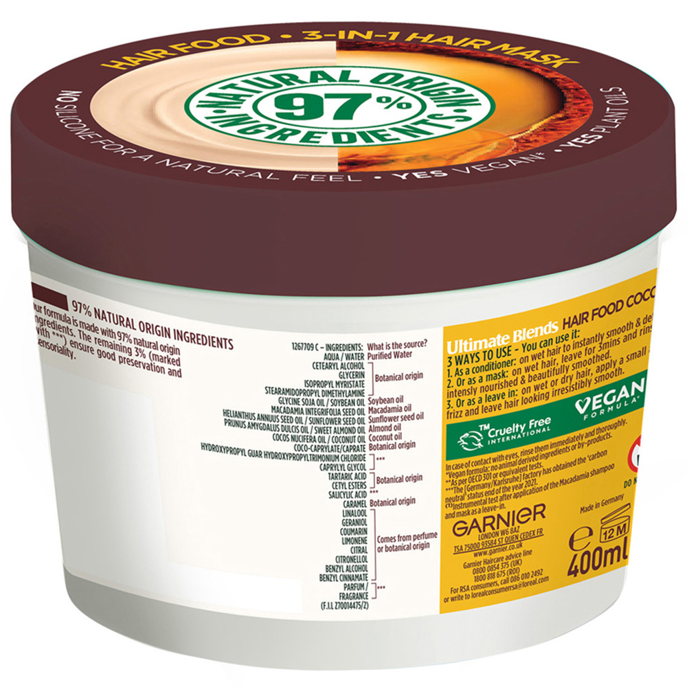 Elevate your hair care with the Garnier Ultimate Blends Hair Food Coconut Oil 3-in-1 Frizzy Hair Mask Treatment 390ml. This effective hair mask nourishes and conditions your hangry hair with its 3-in-1 intensive hair treatment. Perfect for taming frizzy hair, it can be used as a conditioner, rinse-out hair mask or as a leave-in conditioner. It features a 100% vegan formula with a blend of coconut oil and macadamia, leaving your hair smoother.
