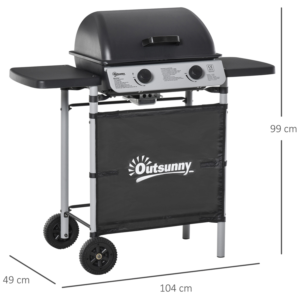Make cooking for events and parties easy with this Outsunny 2-Burner Gas BBQ and Cooking Grill. This gas grill is a great choice for family or friend gatherings and can provide delicious meals for many people. With two burners, each of them can be used individually to prepare different food items at a time. Easy to use, the left burner features a piezo ignition that operates by pushing and turning. Apart from this, the right knob can simply be lit through the built-in flame channel. This device is also equipped with two extension tables on both sides, which provide additional storage and preparation space. Easy to move, the device comes with two wheels for simple manoeuvring around your garden area. For added convenience, it includes a galvanised grease catch pan that is easy to clean to save effort and time (NOTE: It's supposed to be covered with sand that can absorb grease; please clean the grease catcher after use). This unit is an ideal addition for anyone who looks forward to cooking outdoors. Size: 104 x 99 x 49cm. Keep your BBQ covered and protected with our range of premium BBQ covers.