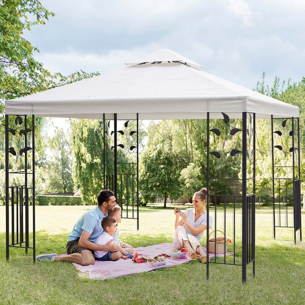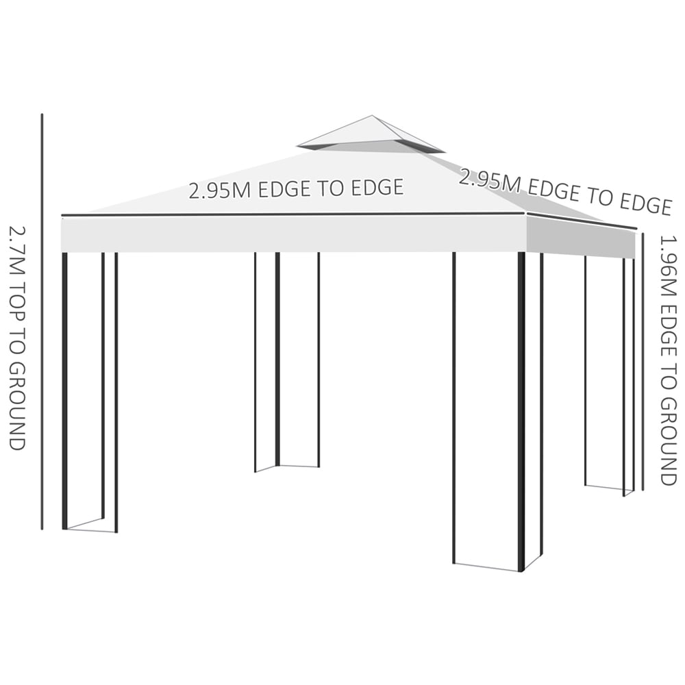 Add an elegant touch to any outdoor space with this 3 x 3m Sunshade Steel Two-Tier Canopy Gazebo from Outsunny. Durable and stable, the canopy features a powder-coated steel frame and stands even steadier when the eight stakes are pinned to it. Apart from this, its cut-out leaf and line design brings an elegant feel - great for stepping up your garden or outdoor party looks. Finished in PA-coated polyester, the gazebo protects you against harmful UV rays and light showers. Also, it comes with a two-tier canopy to allow potential built-up air and heat to escape easily. Size: 3 x 3m.