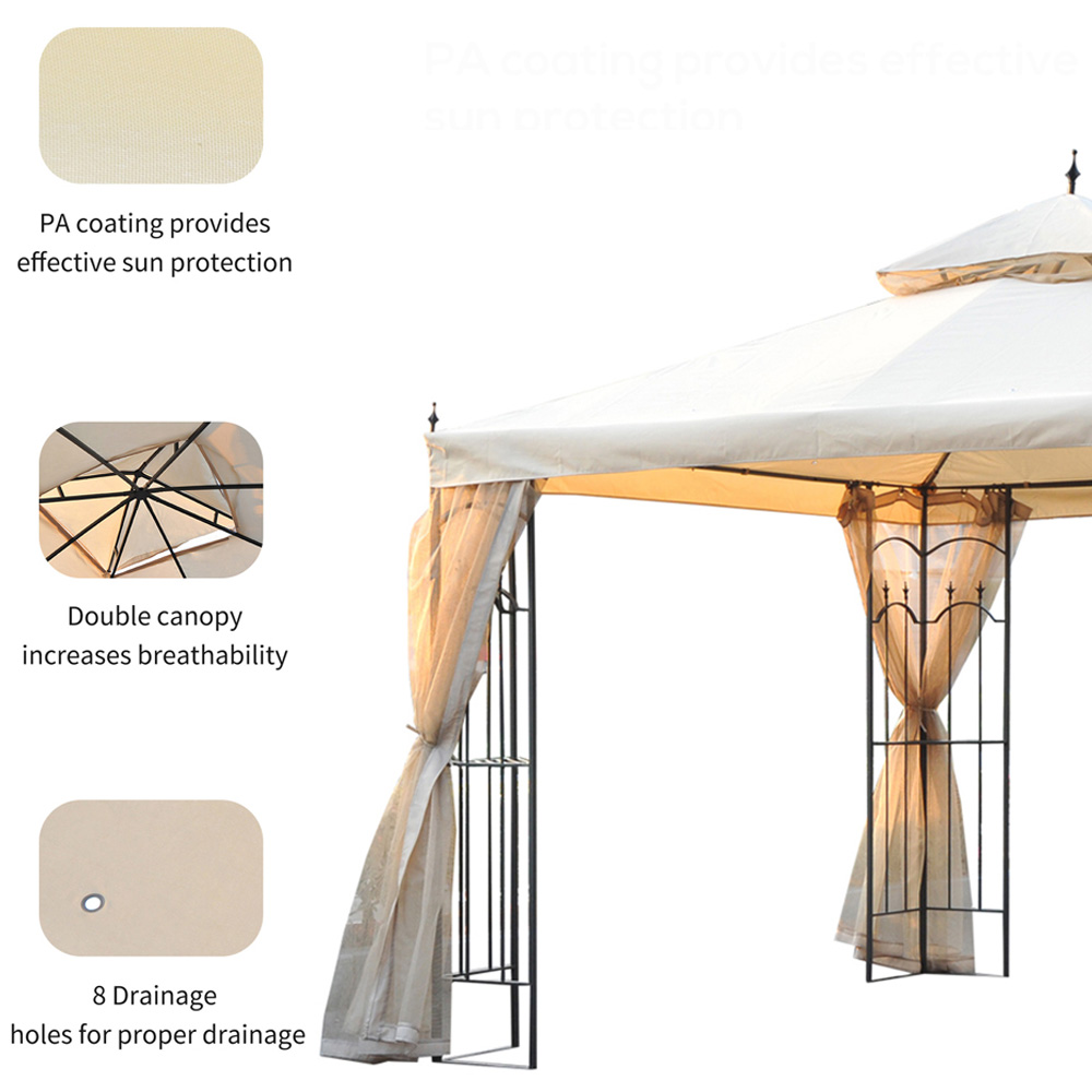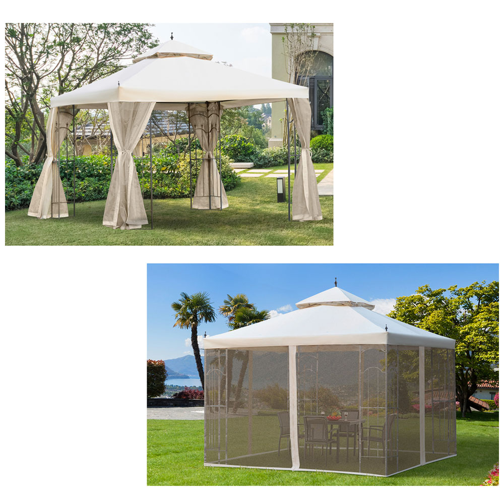 Make a statement in your garden and outdoors with this Outsunny 3 x 3m White Double Top Gazebo with Cream Mesh Curtains. With elegant metal rails placed on each corner, attached curtains and mosquito nets, this unit is perfect to create privacy and keep bugs out. Featuring a two-tier top on the roof, it allows air to flow in and out efficiently. Made using powder-coated steel, the unit offers extra strength and is sturdy enough to stay in place all day long. Also, it is finished with built-in rain grommets, so liquids fall straight to the ground. Easy to fit, it comes with eight ground stakes to offer a firm placement. Apart from this, the gazebo with sides comes complete with four curtains with hooks and loop straps. Size: 3 x 3m.