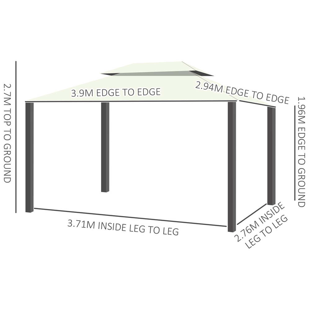 Add life to your outdoors with this Outsunny 4 x 3m Cream Canopy Marquee Pavilion Patio Gazebo Tent with Sides. This stunning tent will provide your family and your friends with comfort. With 160g of water-resistant polyester and a durable, rust-resistant, power-coated aluminium alloy frame, this garden pavilion ensures years of use. Easy to fix, it comes with eight ground stakes for securing your frame to the ground, and the top includes eight built-in drainage holes that prevent water from pooling at the top. Apart from this, the curtained patio tent is perfect to provide privacy while outdoors and preventing insects from entering inside. Size: 4 x 3m.