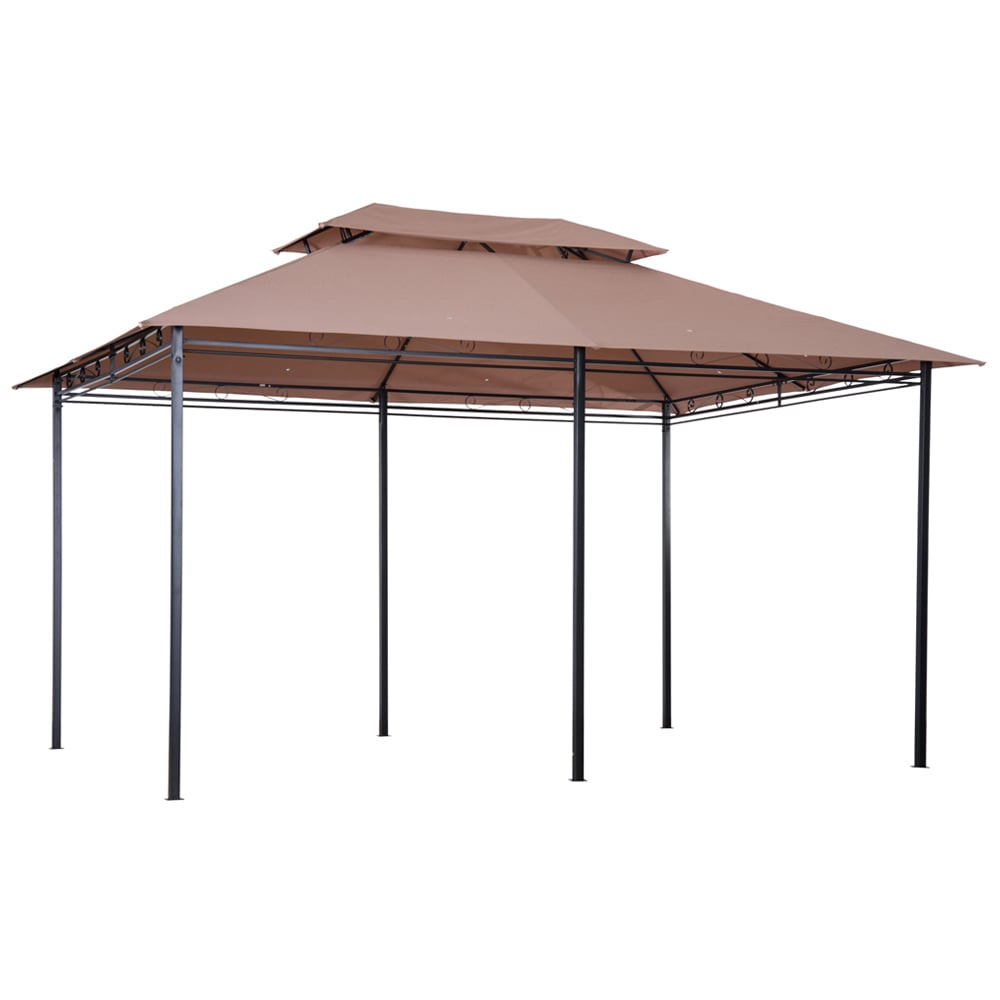 Enjoy partying in the outdoors with this Outsunny 4 x 3m Brown Gazebo Shelter with Curtains. This garden gazebo stands firmly in place thanks to the steel structure and included ground stakes. Also, the two-tiered roof allows air to enter inside, while keeping rain and wind out. Featuring UV-resistant polyester curtains, this unit keeps you protected and offers privacy when required. It additionally comes with hook-and-loop straps for a secure fit to the frame. Generously sized, the gazebo is perfect for all your outdoor parties, events, and activities. Size: 4 x 3m.