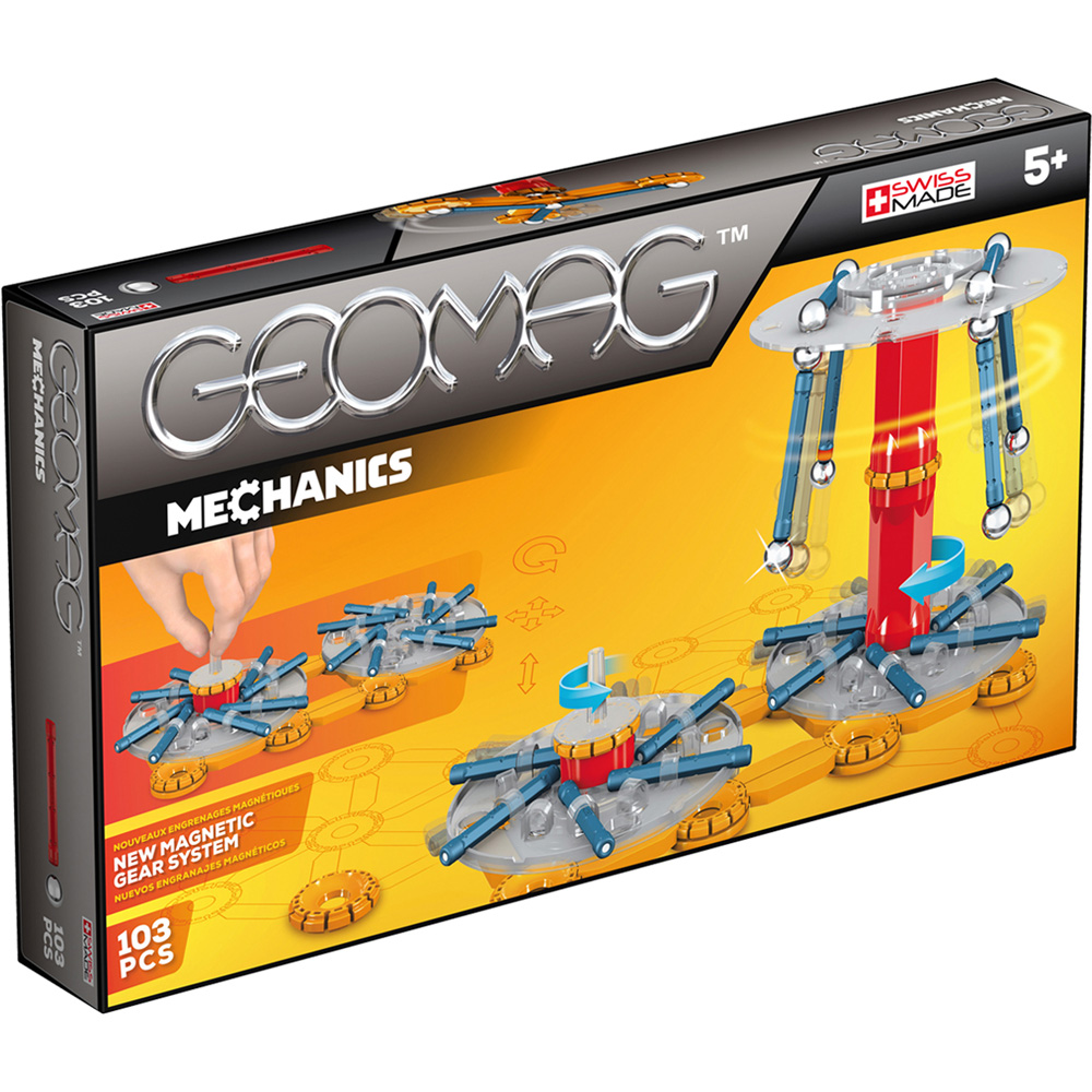 Discover the joy of science with the Geomag 103 Pieces Mechanics. Geomag Mechanics is an extension of Geomag Classic, introducing a different type of movement using typical mechanics elements. This “Expand Magnetic System” is composed of rods and balls, making it possible to design solid structures, and simplifies construction by using a smaller number of rods and balls. You can try various elements from cylinders and modular platforms to build the structure vertically and horizontally. The bearings give movement to the model. These elements add a stimulus to create structures that can be set into motion with a simple hand movement or a compass rod. They set off chain reactions due to the forces of magnetic attraction and repulsion. This Mechanics set is recommended for children aged five and over.