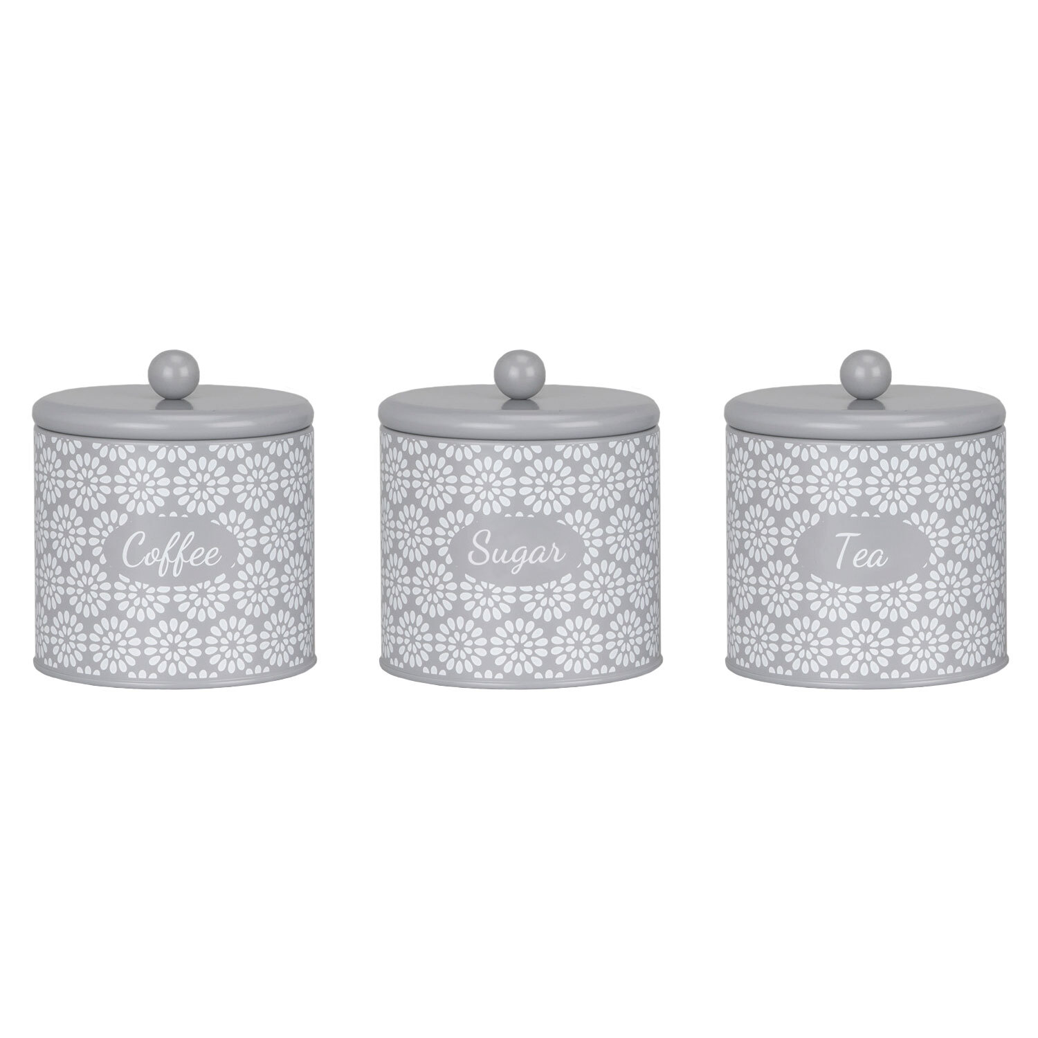 Keep your coffee, tea, and sugar fresh and fashionable with this set of three Geometric Blossom Canisters. Featuring a charming design of geometric flowers all over, each pot is labelled with their contents to help you quickly grab the right one when you're making your hot drinks. Each lid is made with a silicone seal to ensure the containers are kept airtight, and the small bauble handle both adds cuteness and makes opening easy.