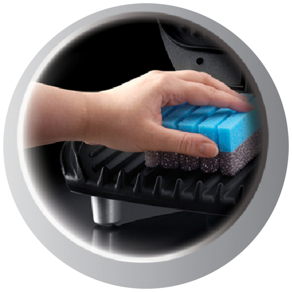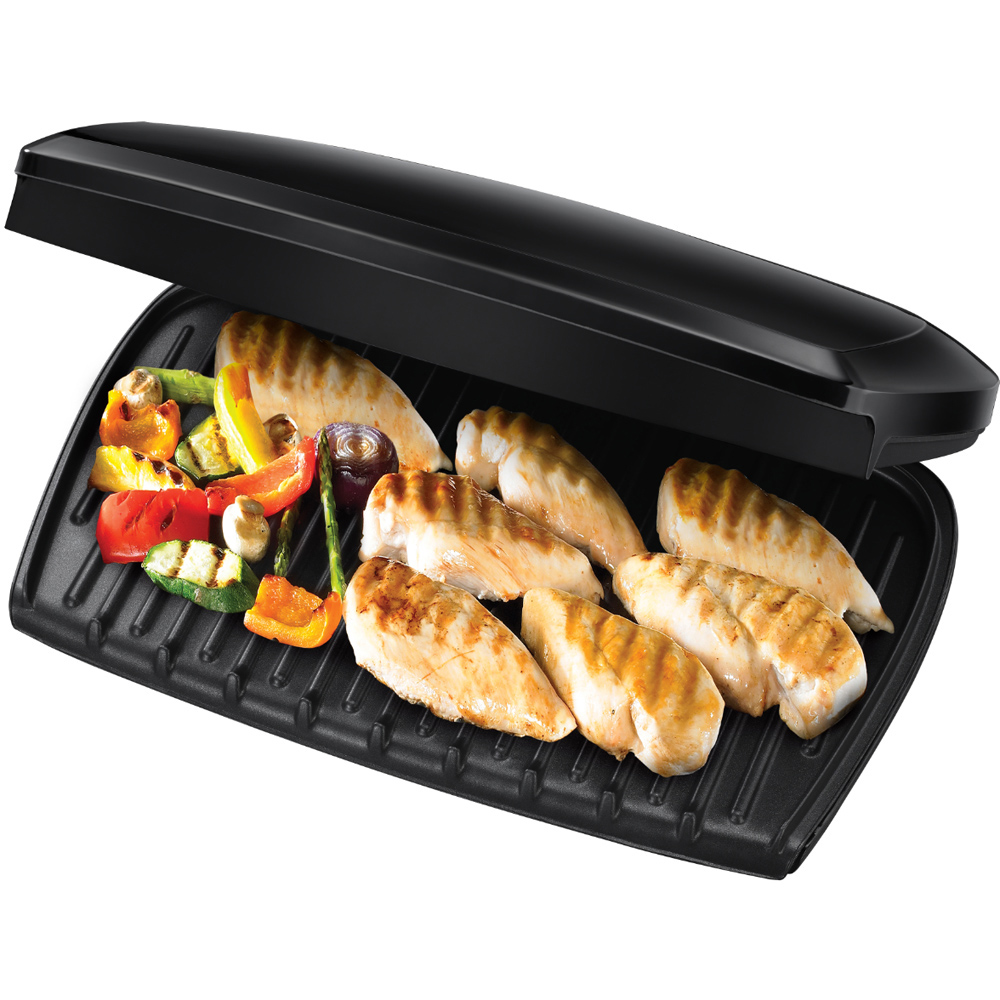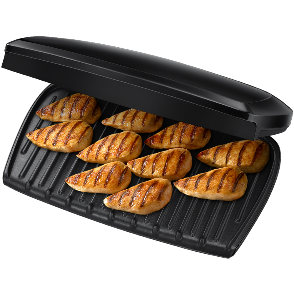 Fire up the flavour with the George Foreman 23440 Classic Black Large Grill 2400W. This easy-to-use grill cooks a whole host of food and can help you to make a healthier, tastier meal or snack in no time. With its cleverly designed floating hinge, the grill easily accommodates extra thick cuts. The grill top can move more freely, making it ideal for toasting sandwiches, paninis, or larger portions. The 970 square centimetre plate is the perfect size for preparing your favourite meals for your loved ones because it can accommodate up to ten portions. The unique angled grill directs fat and grease away from food, and gentle pressure is applied to the food by contact grilling from both sides, which encourages the removal of 42% fat. The non-stick grill plates make cleanup a breeze. Additionally, the grill's adjustable backfoot lets you cook food at an angle or flatten it out to cook more delicate foods like toast or fish. The grill is ideal for larger families, entertaining friends, or even hosting an indoor BBQ.