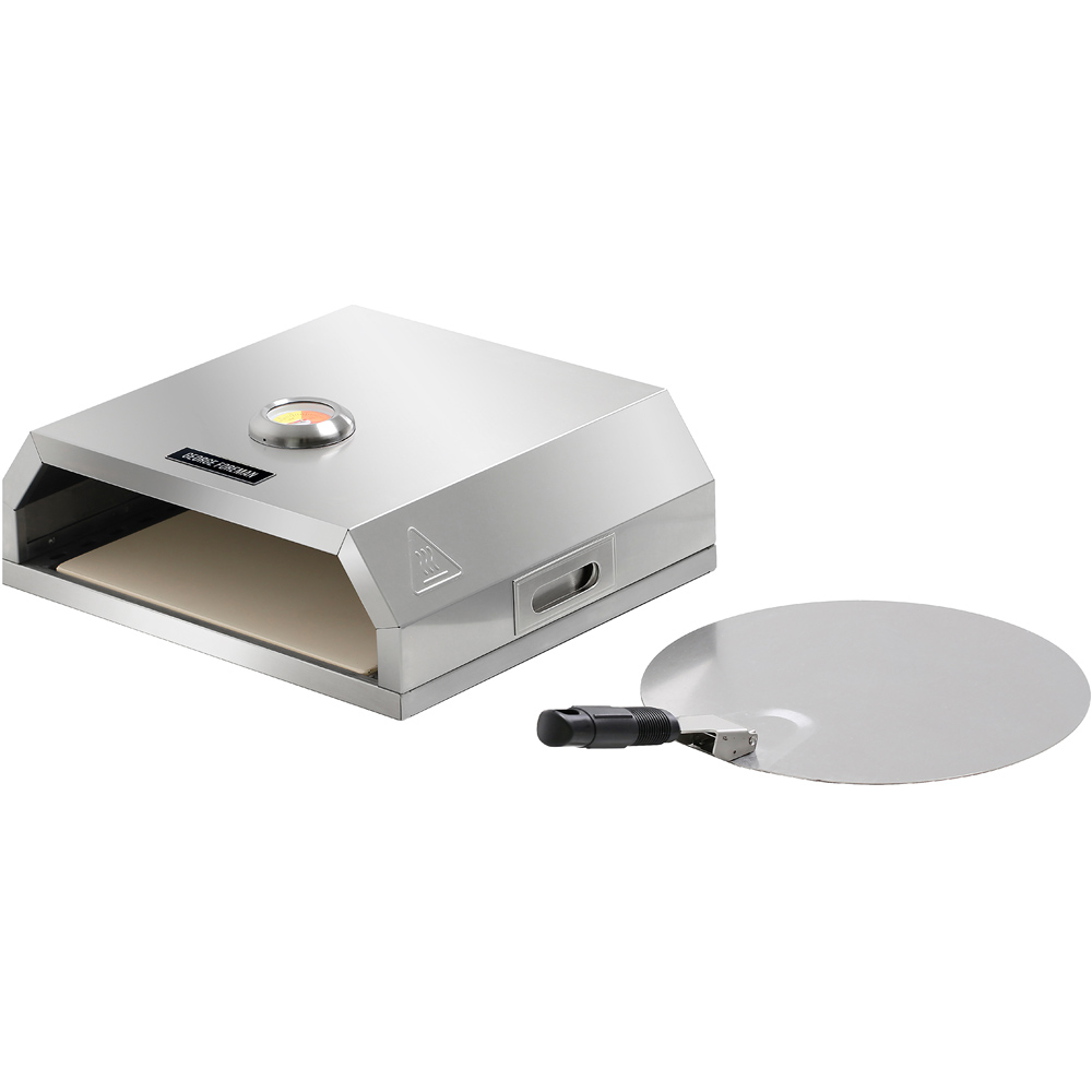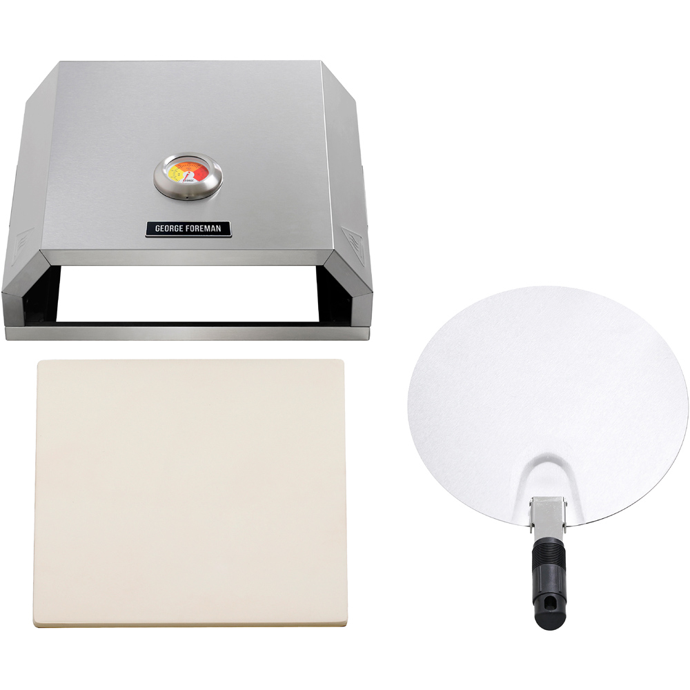 Make a practical addition to your kitchen with the George Foreman GFPO1SSPC BBQ Grill Pizza Oven. It is crafted to bring gourmet pizza to your garden, this BBQ pizza oven will be the star of the show at family gatherings or while entertaining friends. It features an integrated thermostat, so you can control how your pizza is cooked, ensuring a consistent taste and finish every time. It is built with a sleek stainless-steel hood to help trap heat for optimal baking conditions while the ceramic pizza stone ensures an even heat distribution. It is finished with an enamelled base to provide durability and easy maintenance. This pizza oven can be used on both gas or charcoal BBQs, offering versatility to achieve an authentic wood-fired taste. This pizza oven comes with a one-year manufacturer’s guarantee.