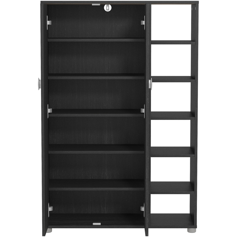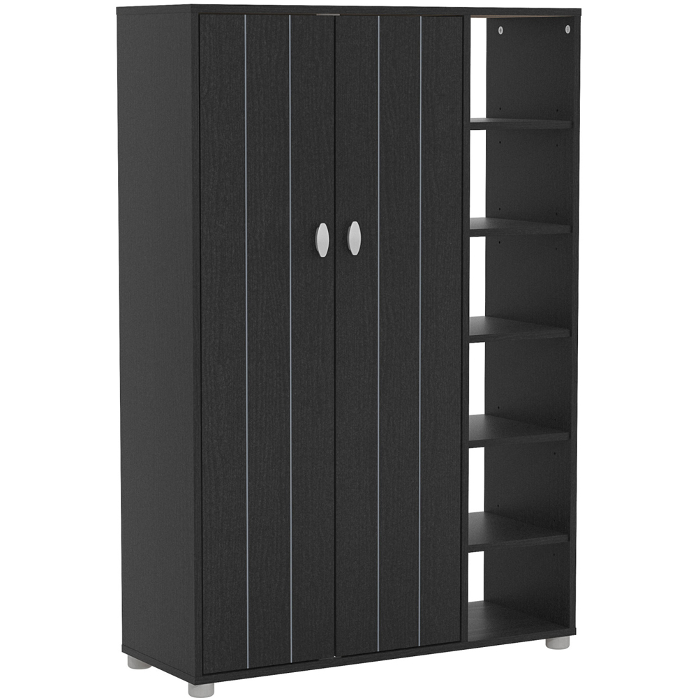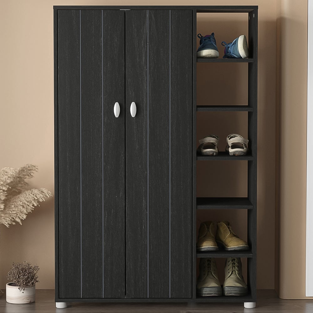 The Bideford features 2 doors and open shelves that provide ample room for shoe storage, making it easy to keep your shoes organized and easily accessible. With its sleek design and durable construction, our shoe rack is perfect for any space in your home, from your entryway to your closet. Say goodbye to cluttered entryways with our shoe cabinet! With ample storage space for up to 24 pairs of shoes, this organizer keeps your footwear neat and tidy while also adding style to your home decor.