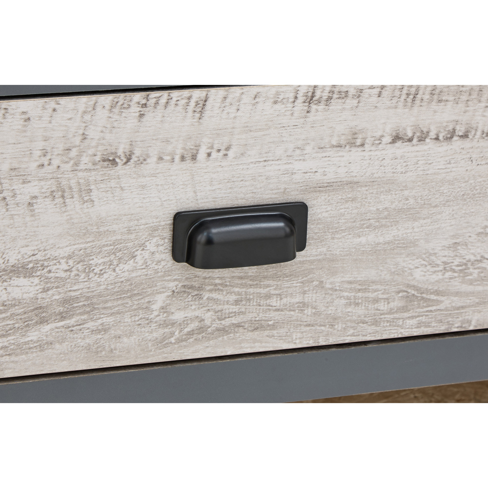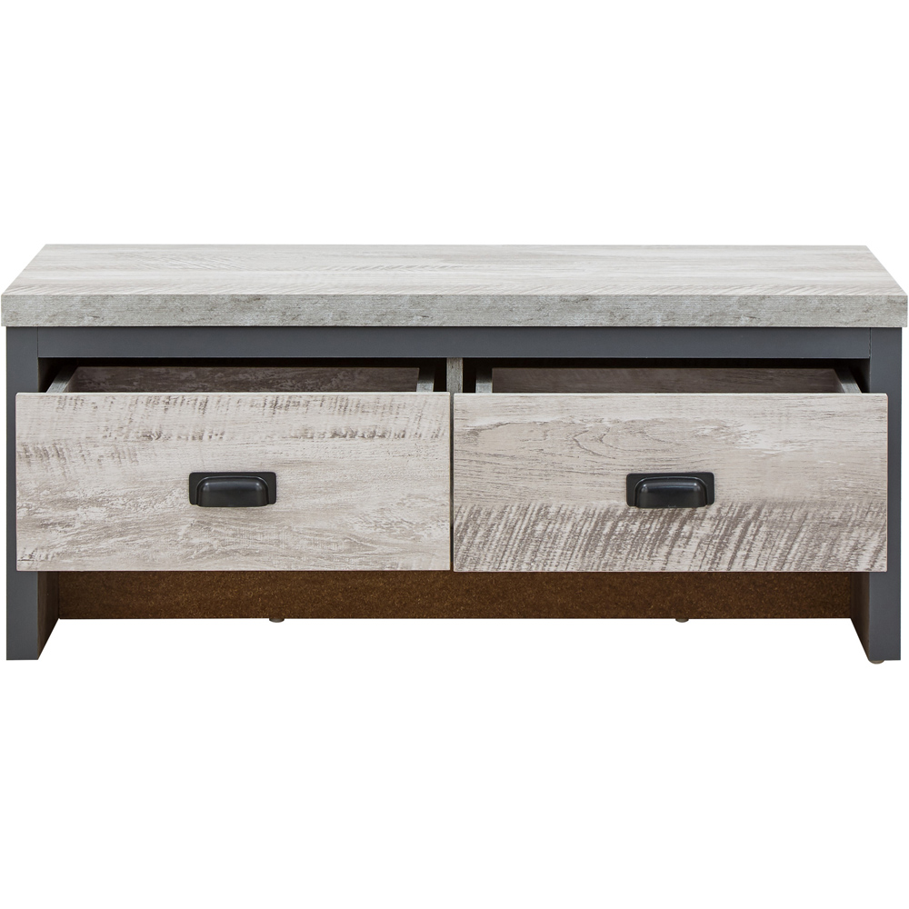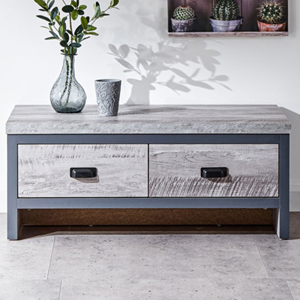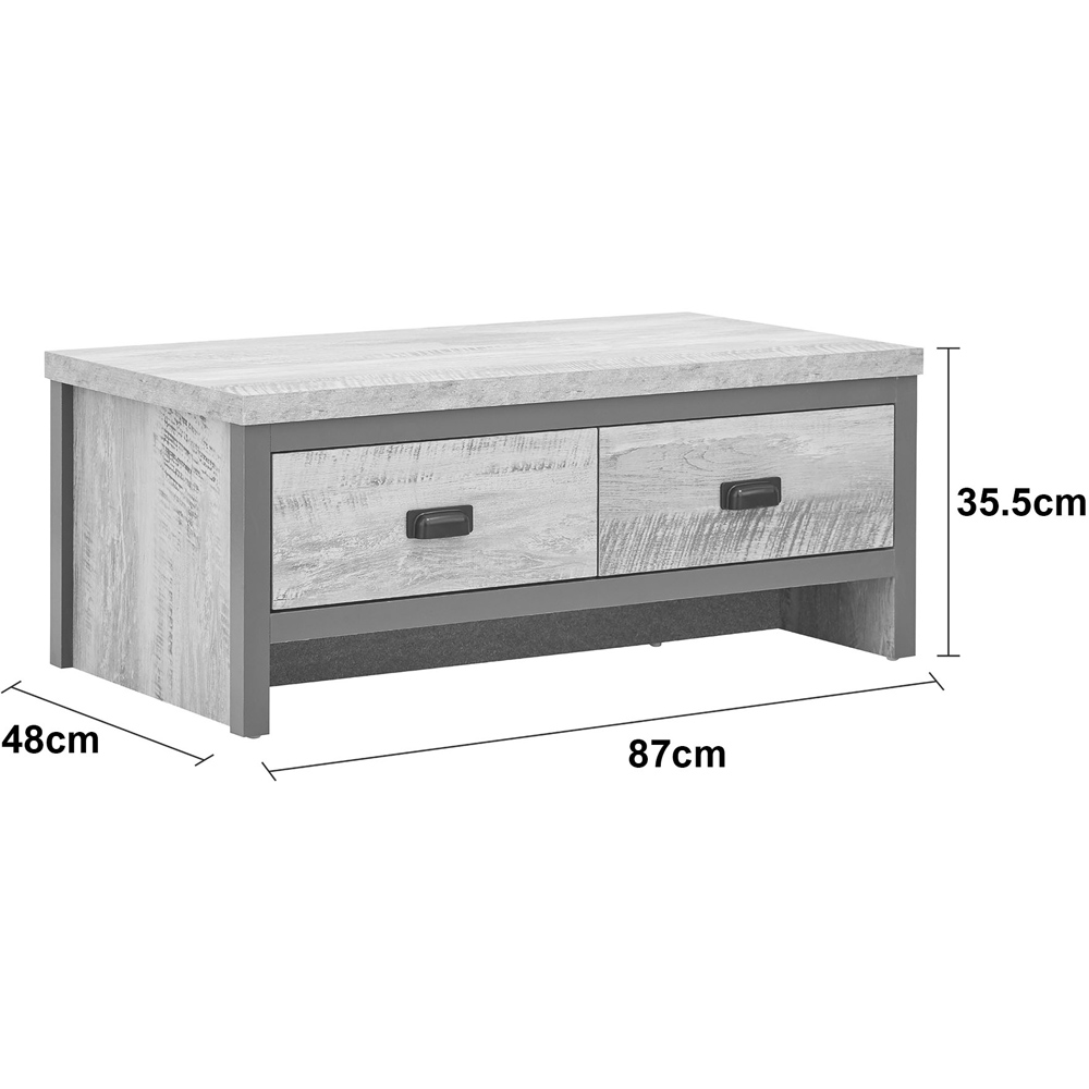 Give your interior a touch of urban chic with this no-nonsense coffee table. The sturdy construction is finished in a durable distressed oak or industrial grey effect with a chunky 30mm top and deep wooden frame in contrasting grey tones, providing an authentic look and feel. The two deep drawers have a matching wood-effect finish inside and are ideal for magazines, books and TV control boxes. The matching faux drawer fronts on the opposite side create a pleasingly symmetrical design without sacrificing storage depth.