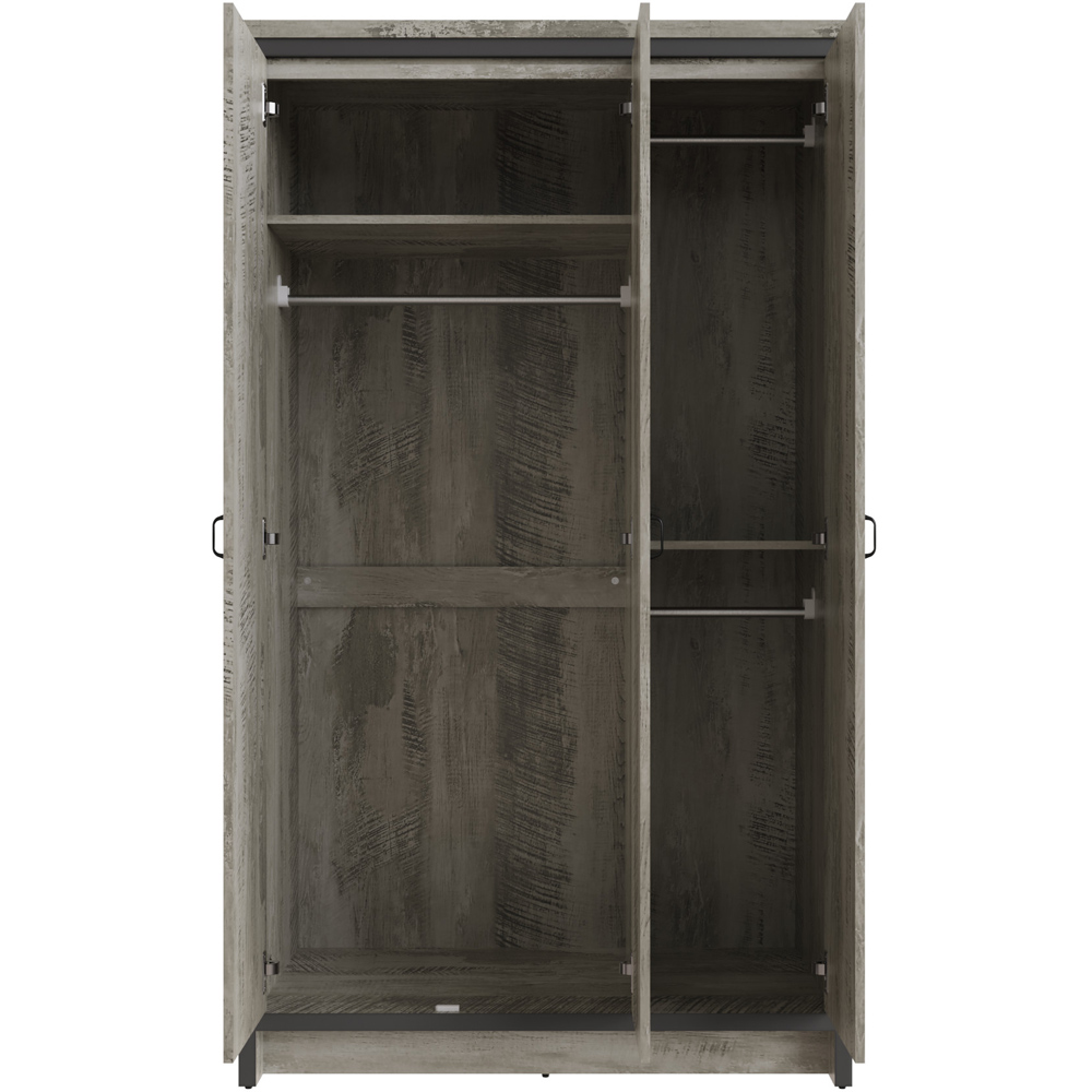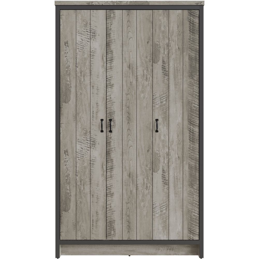 Give your bedroom a makeover with the stylish Boston Bedroom Range. The industrial-inspired design of the Boston is a good match for a contemporary interior, offering a pared-back, reclaimed-effect look and feel that reflects the urban aesthetic. The three-door wardrobe offers both hanging and shelf space, allowing for both shoes and folded clothes to be stored away easily. The chunky panels – including 30mm tops – are neatly framed by the contrasting casing and accessorised by black metal handles that enhance the urban aesthetic perfect for your bedroom!