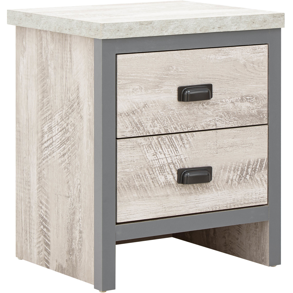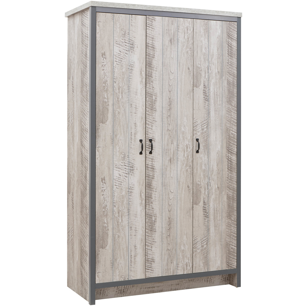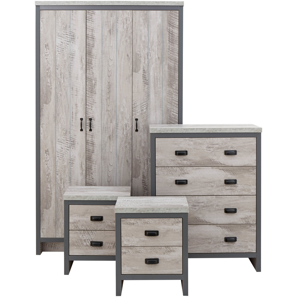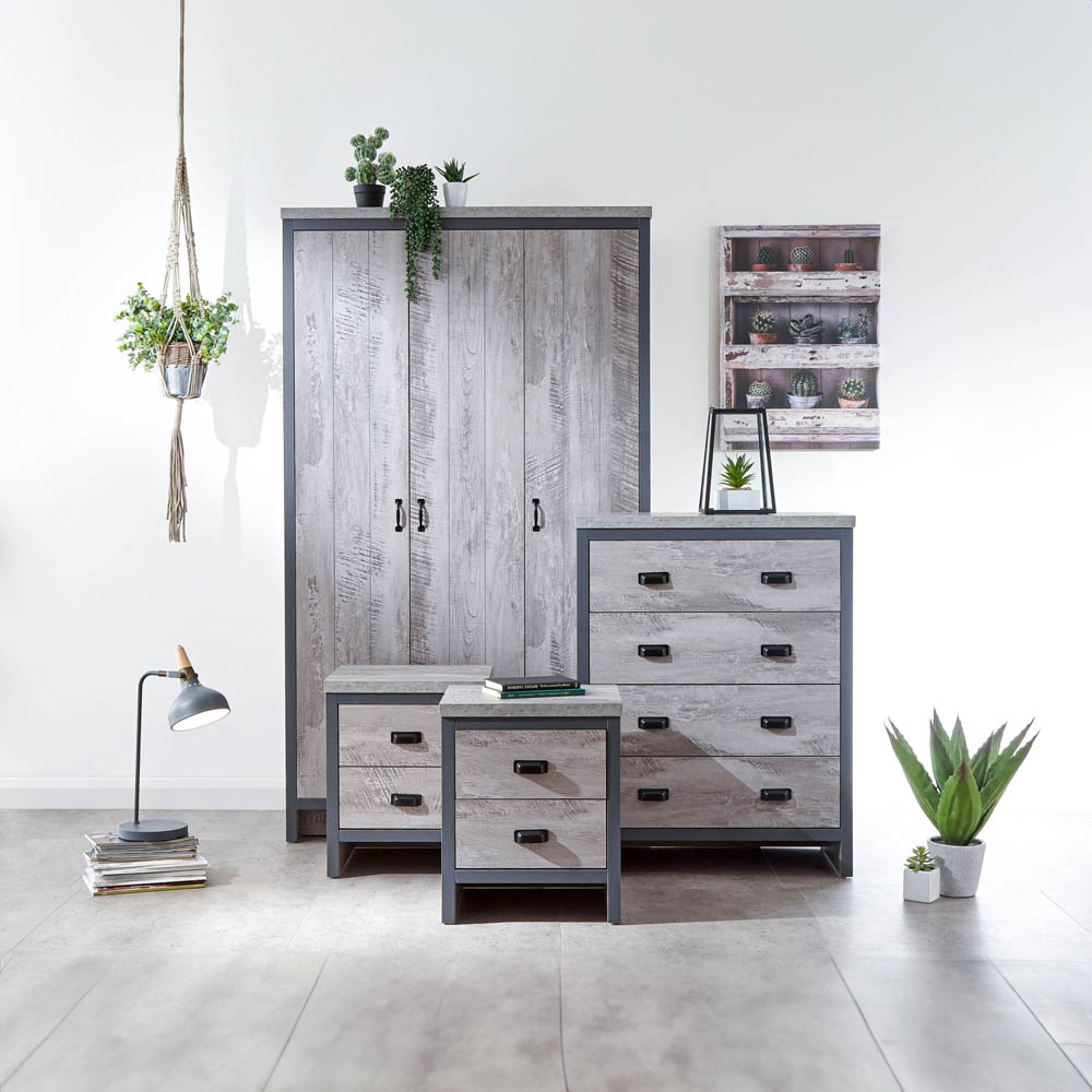 Transform your bedroom with this fabulous 4-piece GFW Boston Grey Bedroom. The sturdy construction with the reclaimed-effect creates such a bold industrial look. The chunky panels – including 30mm tops are neatly framed by the contrasting casing and accessorised by black metal handles that enhance the urban aesthetic. The wardrobe contains tall hanging space, perfect for full length dresses or long coats. It also contains deep shelving for shoes, folded clothes or out of season clothing. This set incorporates a three-door wardrobe with hanging and shelf space, four-drawer storage chest and a pair of two-drawer bedside tables.