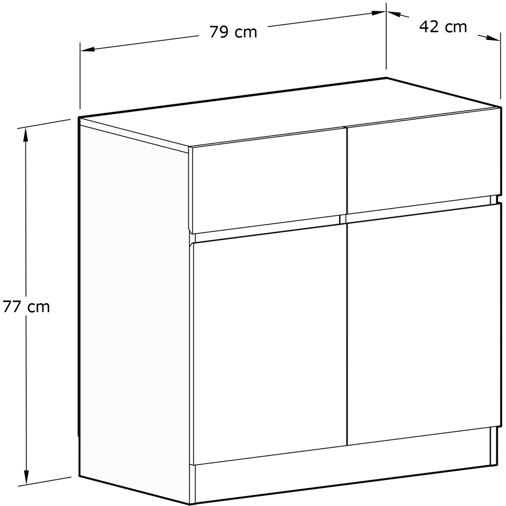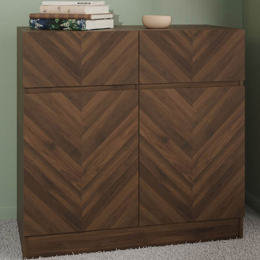 The GFW Catania Royal Walnut Compact Sideboard Unit provides a sleek and modern storage solution for your home. Crafted with clean lines and a minimalist design, this piece features notches on the edges that serve as handles, eliminating the need for unsightly hardware. With two spacious drawers and two doors boasting herringbone inspired wood-grain finish, this sideboard provides ample storage space for your belongings while adding a touch of sophistication to your decor. Whether you're looking to declutter your living room, dining room, or bedroom, this versatile piece is sure to meet your needs.