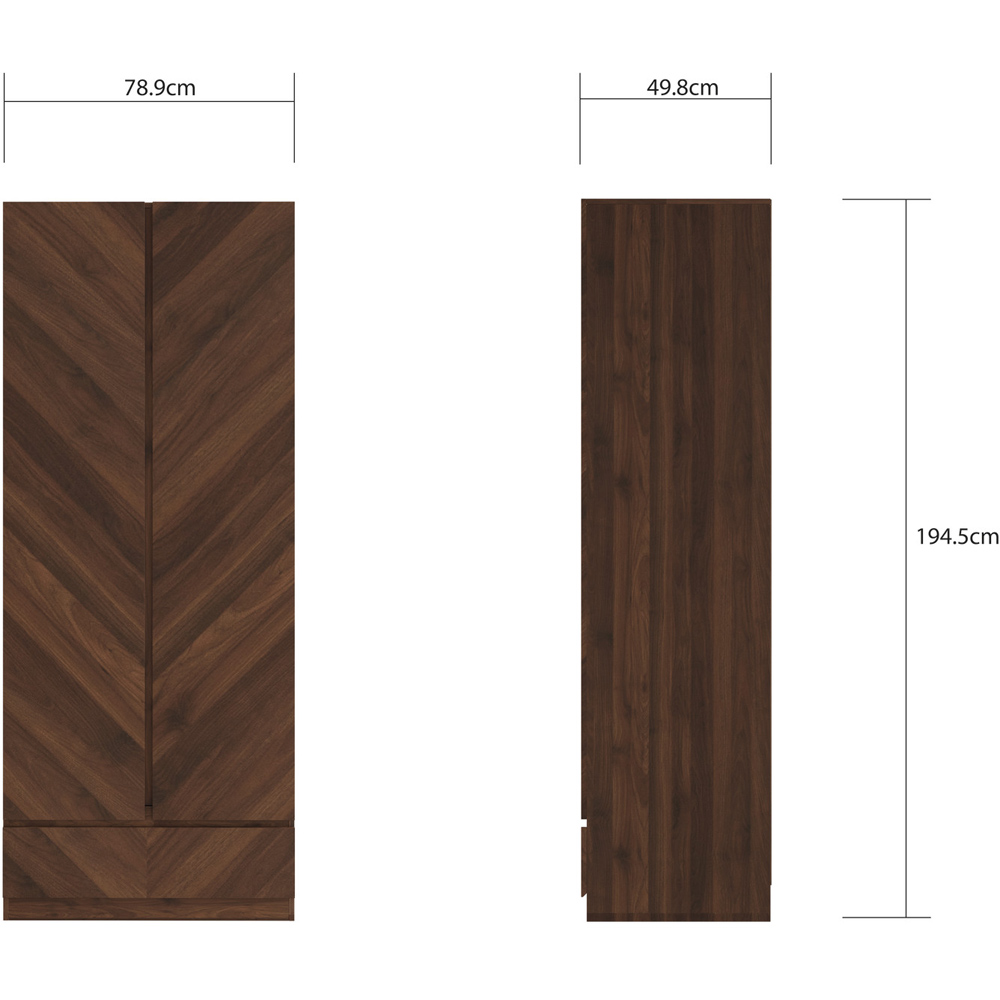 Make a stylish and practical addition to your home with the GFW Catania Royal Walnut 2 Door Single Drawer Wardrobe. This statement two door one drawer wardrobe has a Herringbone inspired wood-grain finish. The tall doors provide easy access to a full width hanging rail giving plenty of storage space. It features full width bottom drawer on metal runners offers easy access to your additional storage. This wardrobe arrives ready to assemble with instructions included.