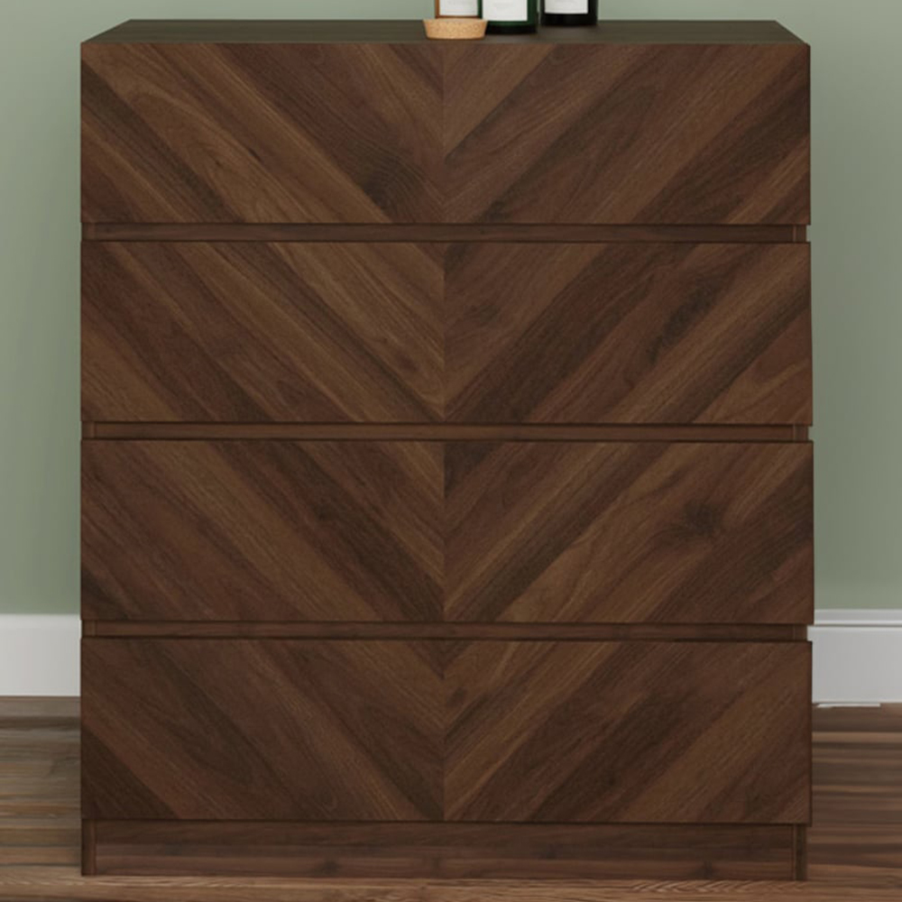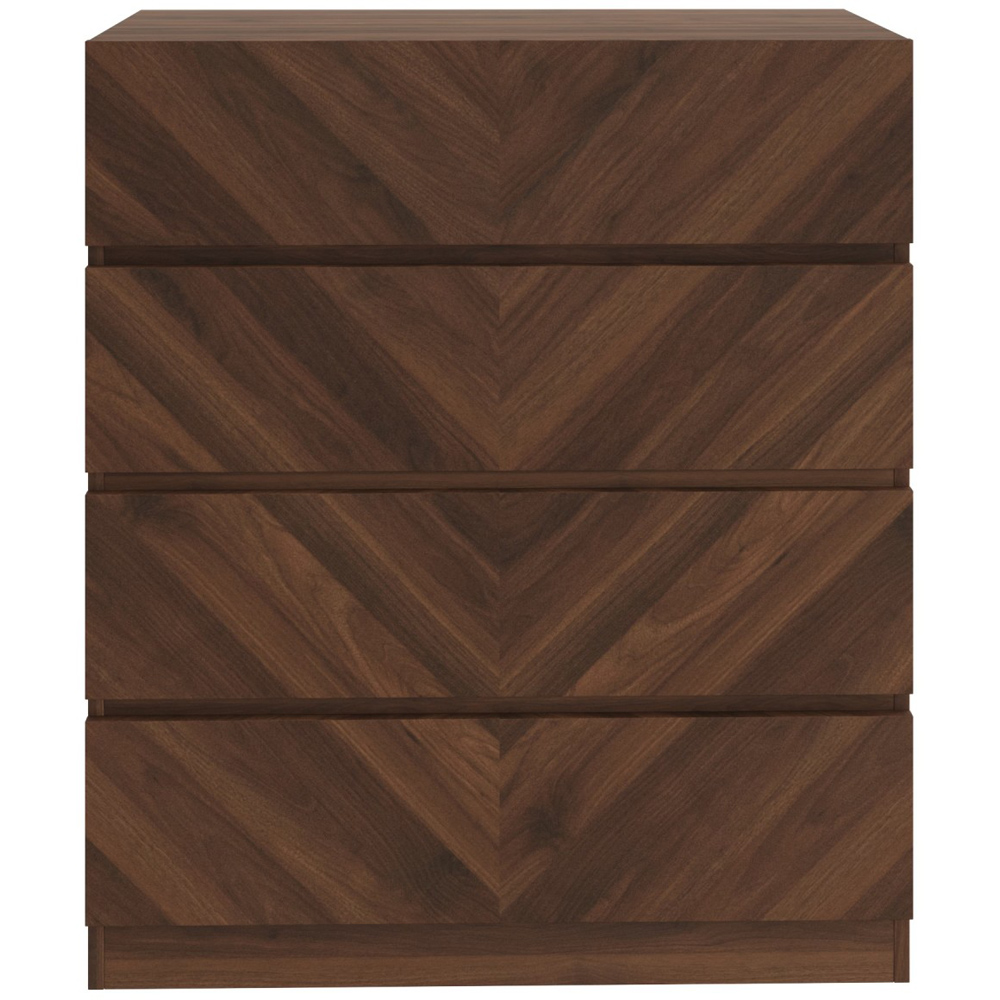 Delivering both style and practicality, this spacious full-width four-drawer chest features Herringbone-inspired wood-grain design drawer fronts, which make a true statement in any room setting. The handle-free drawer system opens smoothly on the metal runners, providing plenty of storage space for all your personal items. This chest of drawers arrives ready to assemble with instructions included.