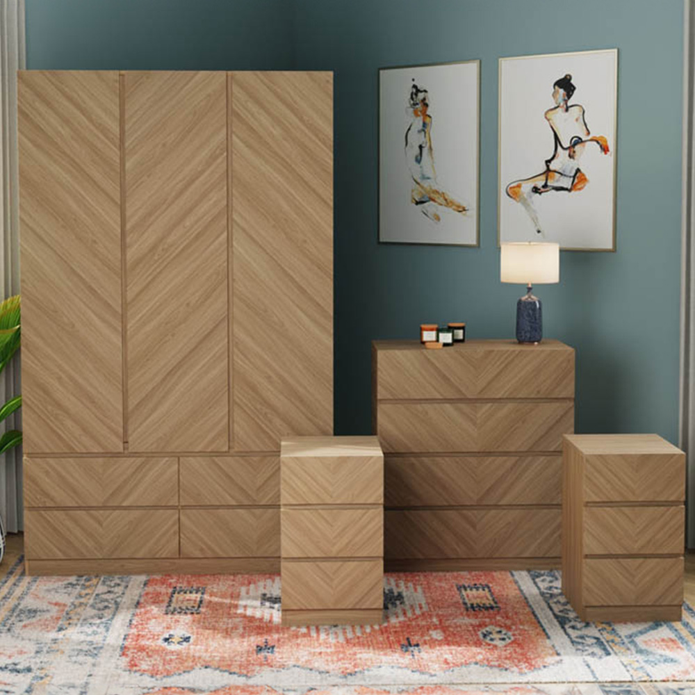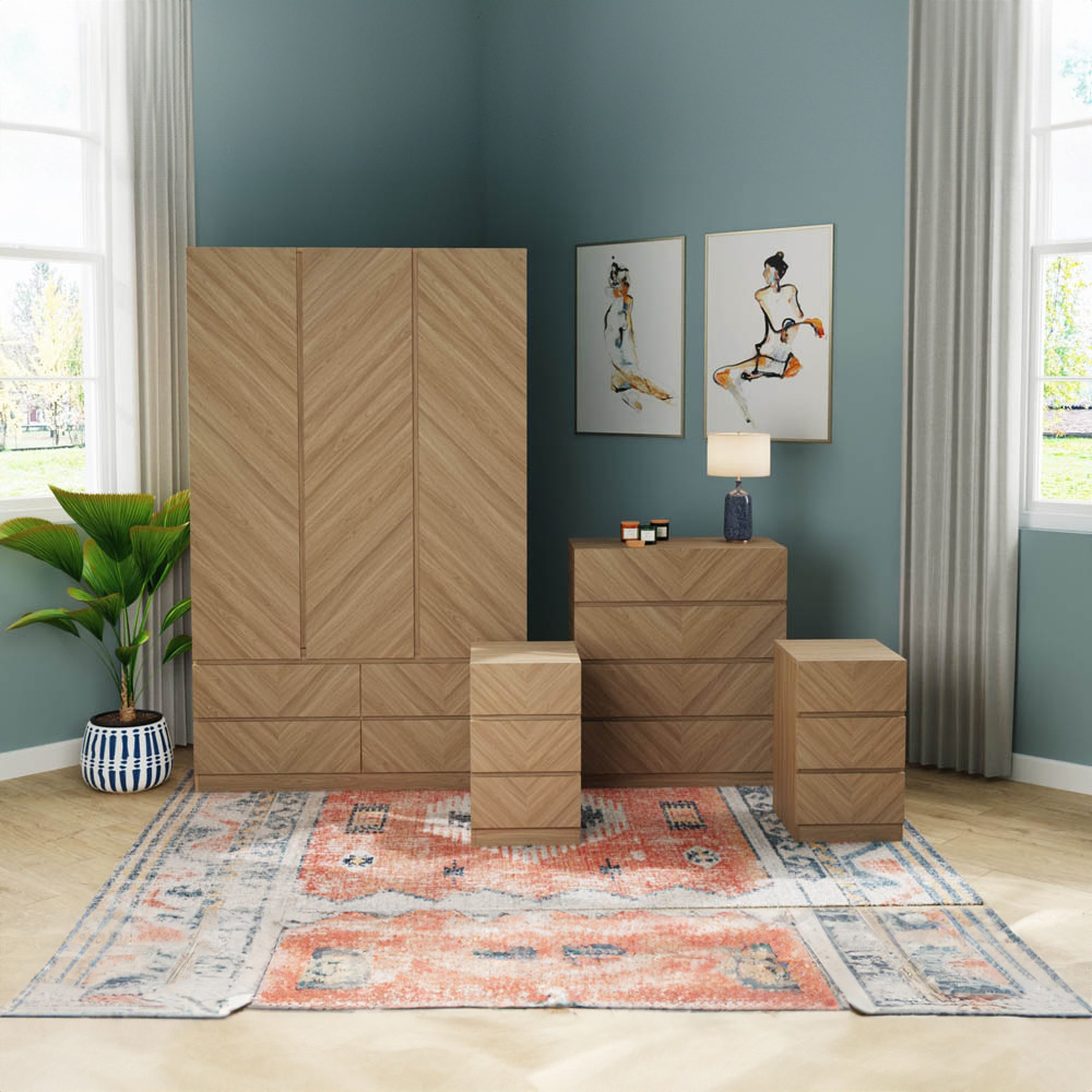 Transform your bedroom with the GFW Catania Euro Oak Bedroom Set. Featuring stunning Herringbone oak woodgrain-effect - this range features a sleek three-door wardrobe, a spacious four-drawer chest, and two compact three-drawer bedside table. Simple styling with statement herringbone design detailing and generous proportions. Dimensions: Height x Width x Depth: 3 Door Wardrobe: 195 × 119.5 × 51.5cm. 4 Drawer Chest: 89 x 77 x 39.5 cm. Bedside: 60.5 x 35 x 40cm. Set of 4.