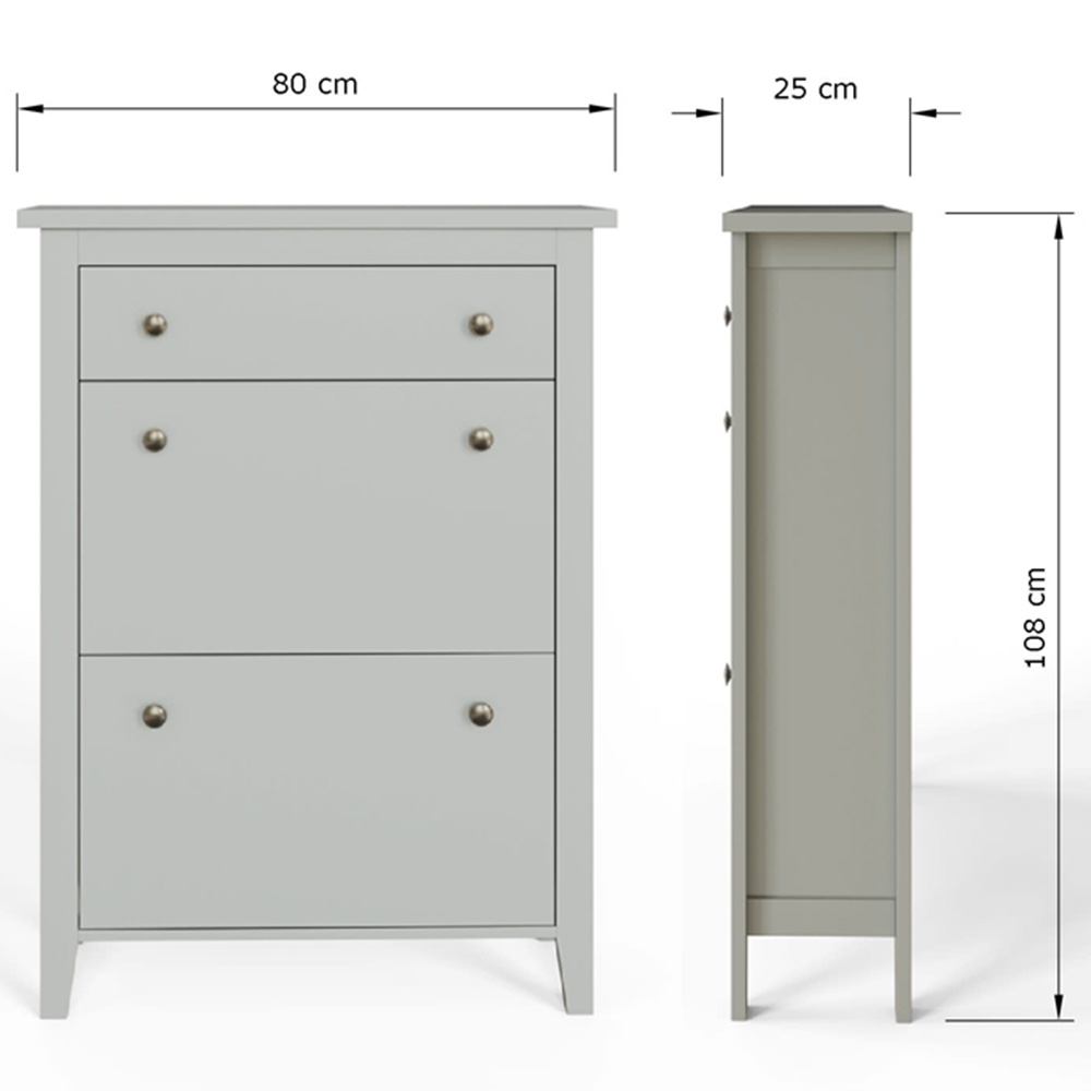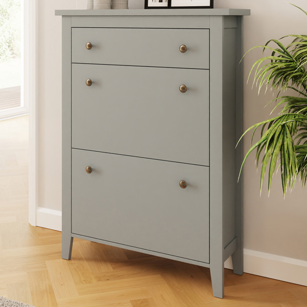 A stylish unit for the modern home, this shoe storage cabinet from GFW provides the perfect solution for hallway clutter, holding up to twelve pairs of shoes. Finished in a soft grey with two drop down doors for shoes and a handy drawer for other smaller items and essentials, the chic design adds stylish appeal to a contemporary home.