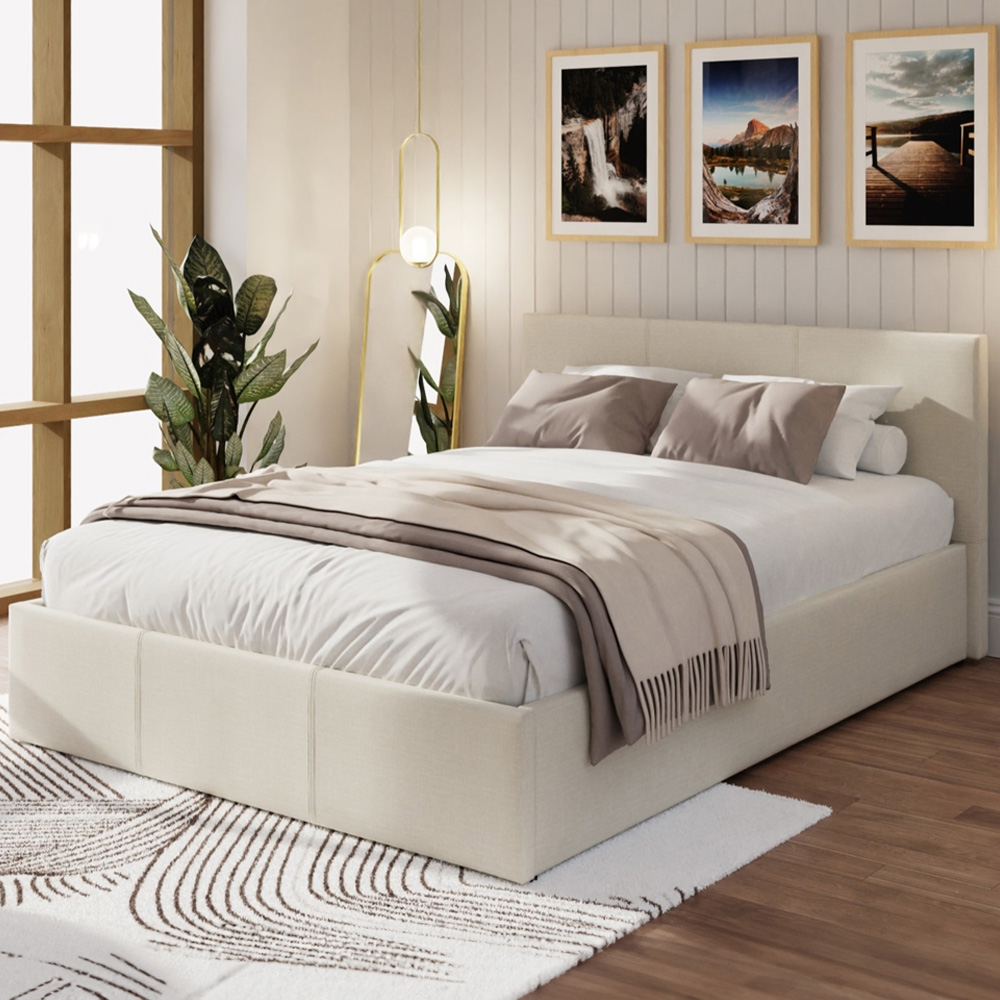 Add a soothing touch to your bedroom decor with the GFW Double Natural Ottoman Bed. This bed provides both class and practicality with plenty of storage space. It is upholstered using durable hopsack fabric for a cosy look and feel. It has a subtle stitched pattern with an elegantly designed headboard and footboard. It features a slatted mattress base with a strong centre support beam for greater comfort. It also features a gas lift hydraulic mechanism for instant access to the concealed storage space. This Ottoman bed provides ultimate comfort with a sturdy base for stability and support.