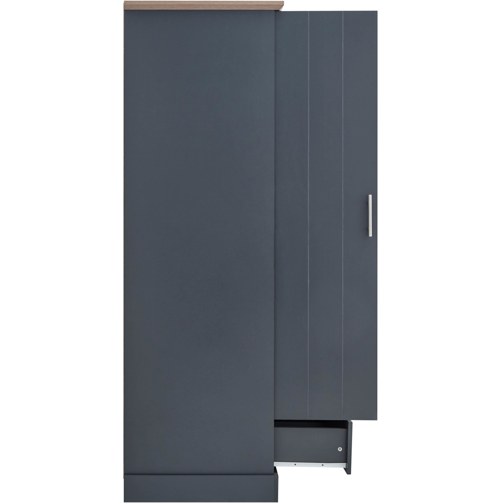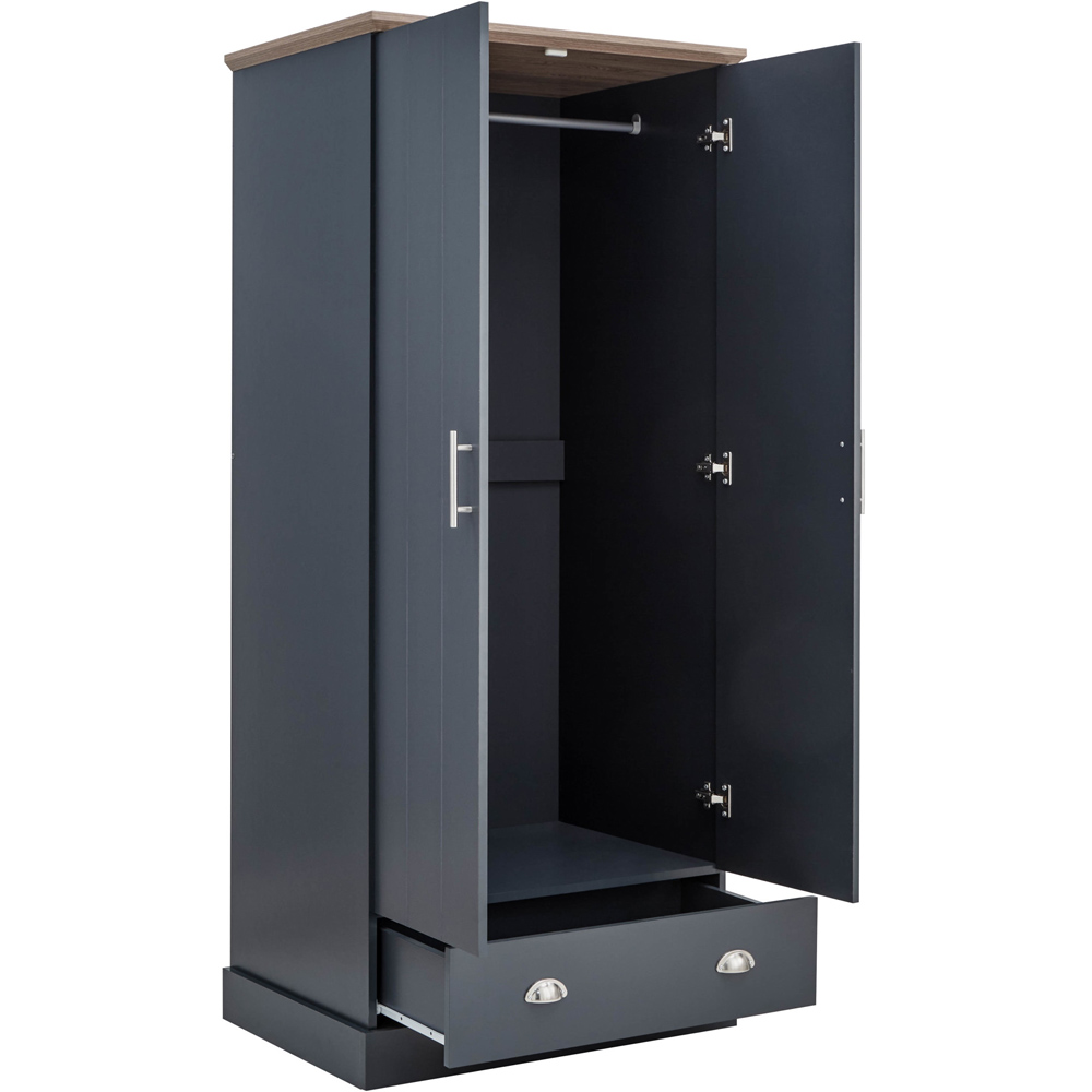 Bring a touch of country cottage chic to any bedroom with this GFW Kendal Slate Blue 2 Door 1 Drawer Wardrobe. The robust frame is mounted on a proud plinth and fitted with a pair of planked-style doors, incorporating a handy drawer beneath. The piece is painted in soft grey and finished with a bevelled oak-effect top that adds a natural contrast. Accessorised with brushed steel handles, it makes an elegant choice. Dimensions: 58 x 78 x 180cm.