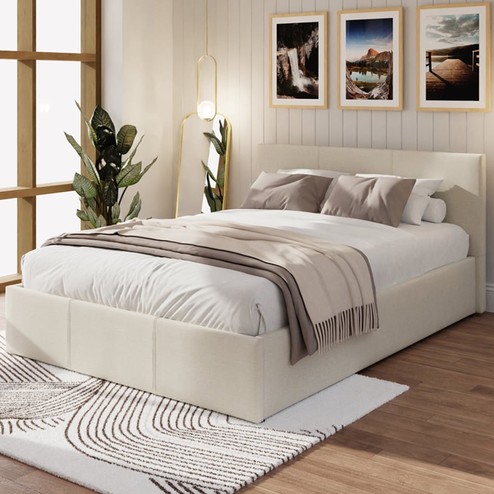 Add a soothing touch to your bedroom decor with the GFW King Size Natural Ottoman Bed. This bed provides both class and practicality with plenty of storage space. It is upholstered using durable hopsack fabric for a cosy look and feel. It has a subtle stitched pattern with an elegantly designed headboard and footboard. It features a slatted mattress base with a strong centre support beam for greater comfort. It also features a gas lift hydraulic mechanism for instant access to the concealed storage space. This Ottoman bed provides ultimate comfort with a sturdy base for stability and support.