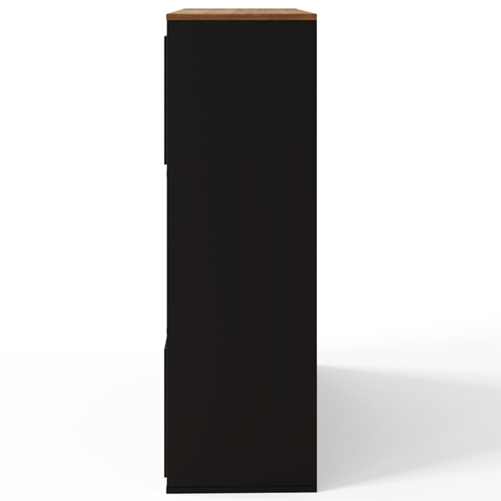 Enhance your living area with both style and functionality by choosing the GFW Kube 5 Drawer 4 Shelf Black and Walnut Storage Unit. This unit seamlessly merges modern design with practical storage solutions. Constructed from top-quality particleboard featuring a sleek black finish and eye-catching medium oak slatted details, this piece introduces a sense of contemporary elegance to any space. The surfaces are treated with melamine and paper foil finishes, ensuring they withstand everyday use and maintain their quality. It provides flexible storage possibilities—some areas are open for showcasing items, while others are concealed behind beautifully textured doors wrapped in non-woven fabric for an added touch of detail. Perfect for living rooms, hallways, or offices, this unit harmoniously combines modern design with effective organisation, making it an excellent choice for any minimalist or contemporary setting.