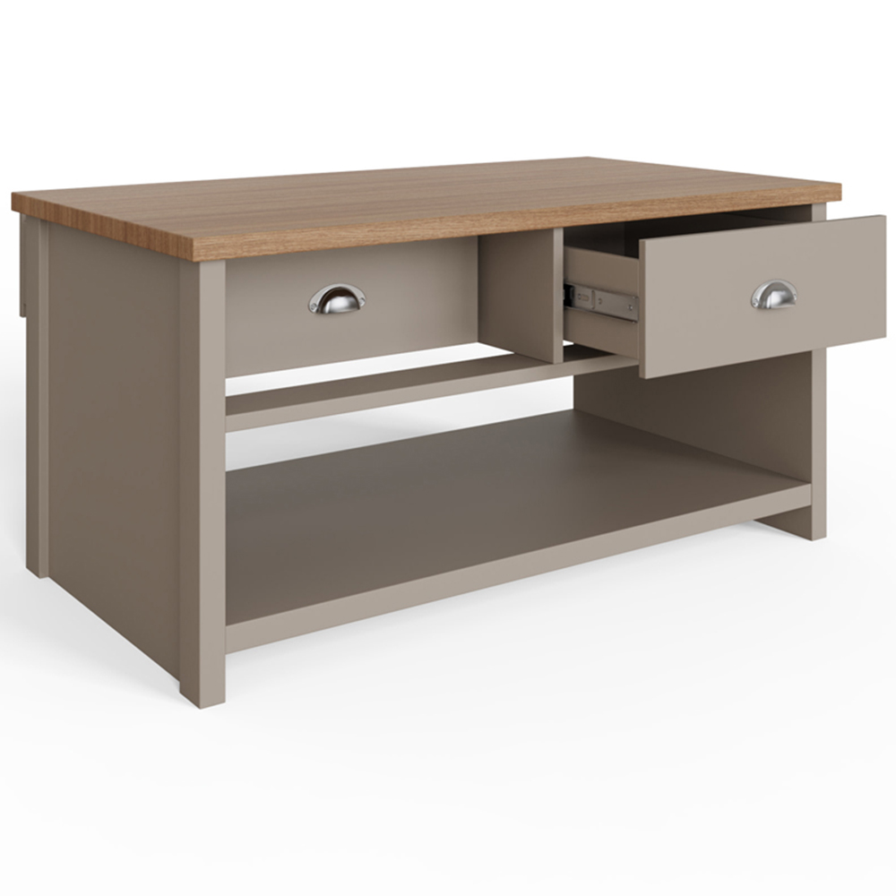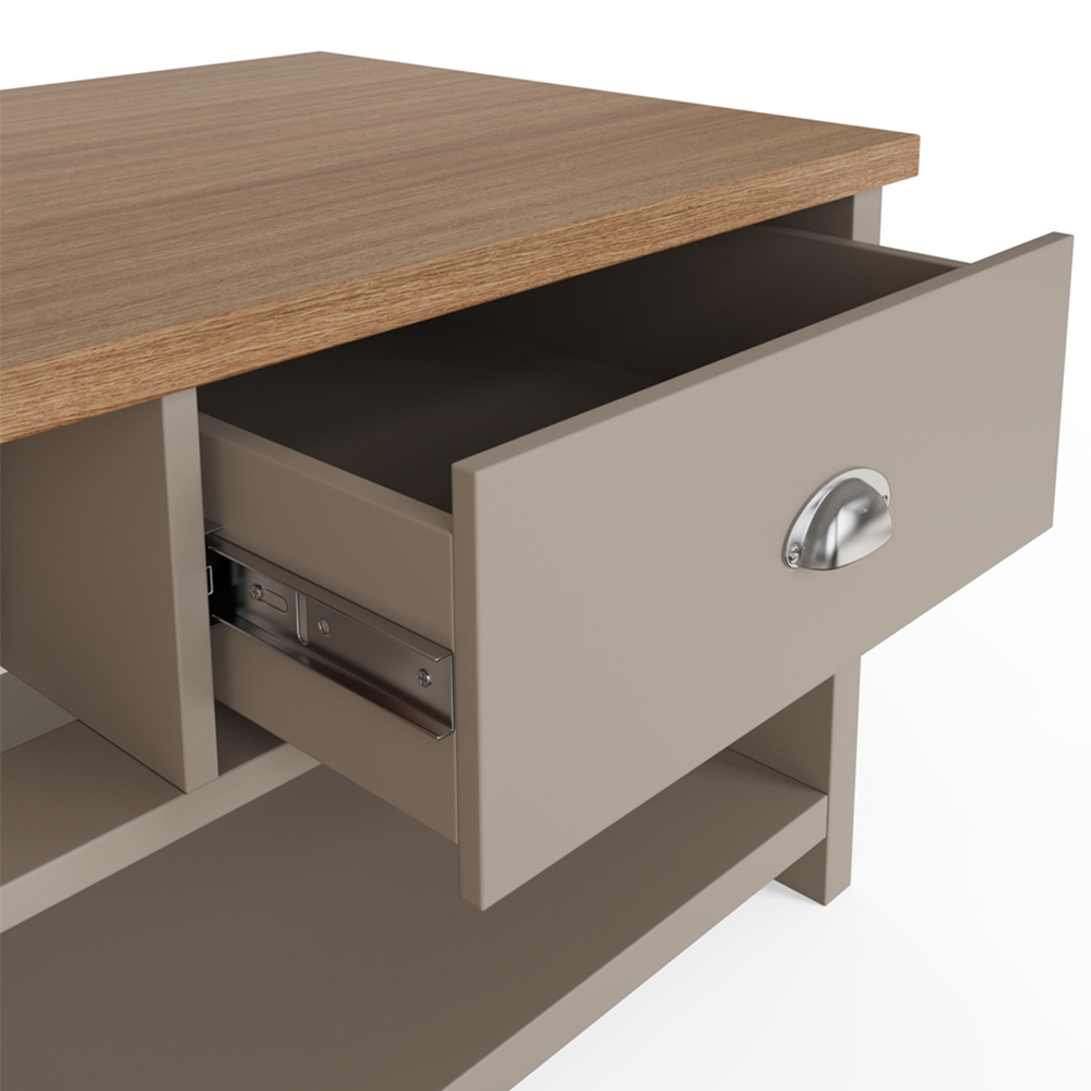 The Lancaster coffee table from GFW features two extremely convenient push or pull drawers with satin silver handles and a large lower shelf. Like the rest of the Lancaster range it is available in a modern soft grey finish with contrasting oak veneer top.